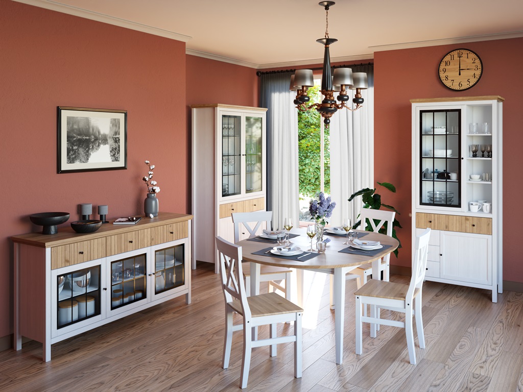 Сканди - коллекция в скандинавском стиле производится из массива сосны в двух цветовых вариантах: белый воск/антик, серый воск Ral 7046/антик. Для выдвижных ящиков используются шариковые направляющие фирмы Хефеле. Внутренние стенки ящиков окрашены в цвет фасадов. На стеклянных дверках используется закаленное стекло (при ударе рассыпается на мелкие кусочки), которое является безопасным. На внешнюю сторону стекла нанесена пленка, имитирующая декоративную расстекловку.