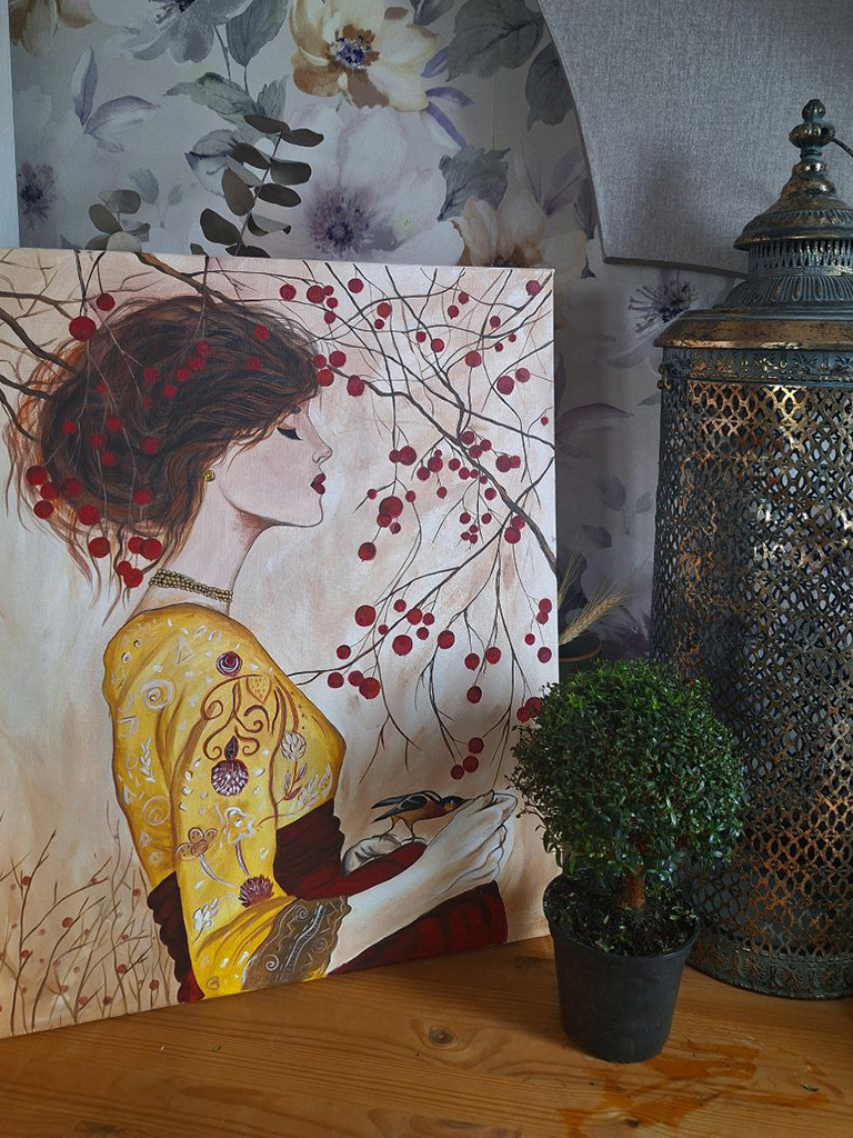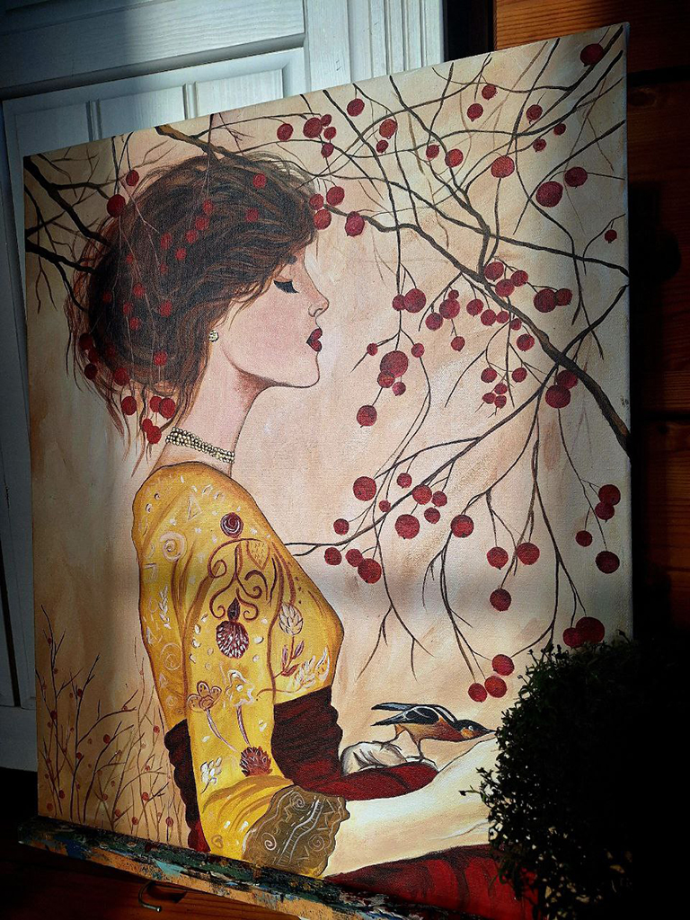 Нежная девушка в ягодном кусте кормит птицу. Украшения девушки покрыты поталью, что дает невероятный блеск при солнечном или искусственном освещении. Картина написана на холсте с подрамником, размер 50 на 60 см. Торцы прокрашены в тон картине. Покрыта защитным лаком