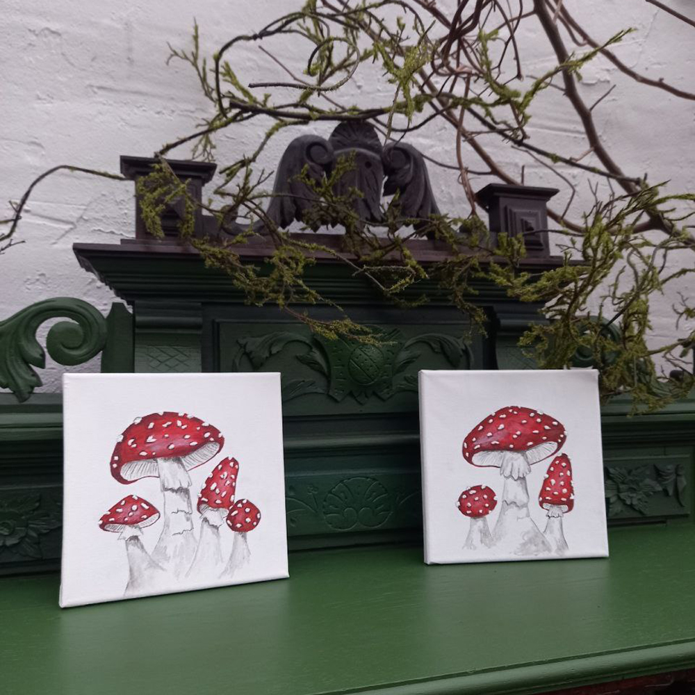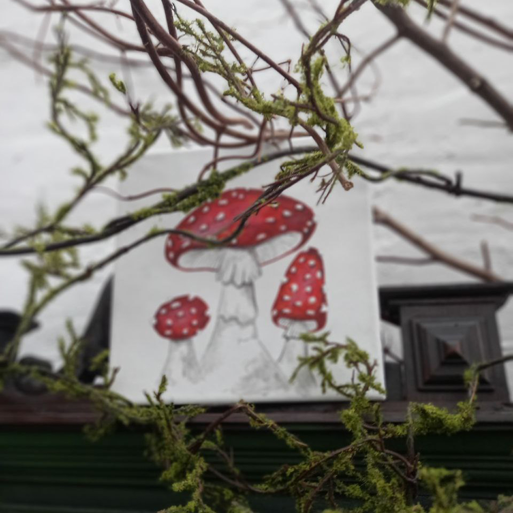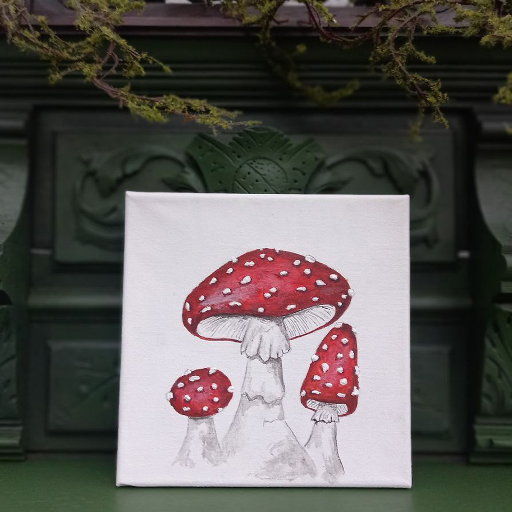 Мухомор – символ удачи, богатства, процветания и радости, а ещё его использовали, как целебное снадобье. Пятнышки у мухомора объёмные. Возможен повтор на большем формате холста.
