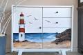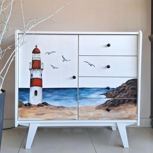 Данный комод в наличии и может быть приобретен из магазина, или же выполнен под заказ с другим рисунком. Выполнен из массива сосны, окрашивание "белый воск" со слегка видимым рисунком сосны.