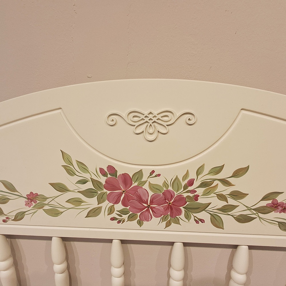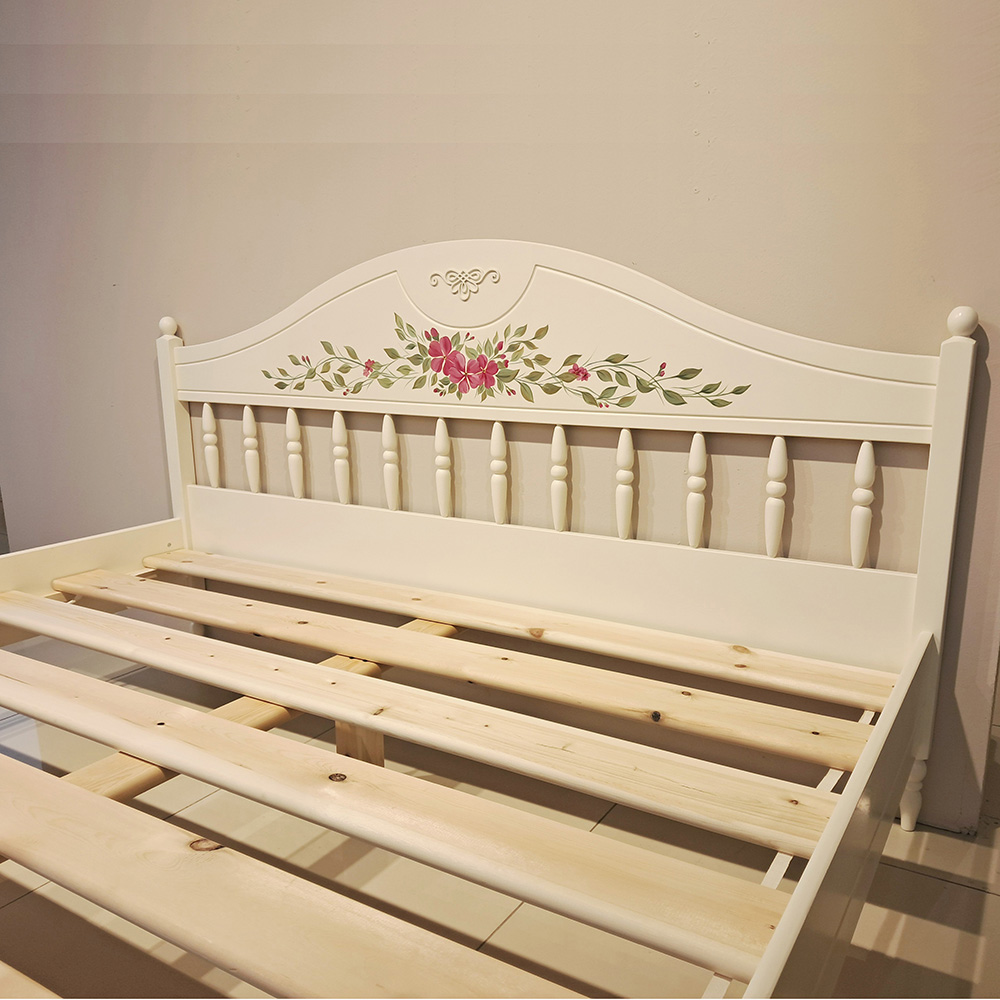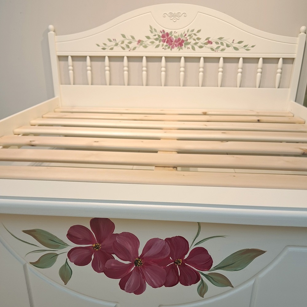 Кровать двухспальная из коллекции Айно, выполнена из массива сосны. Окрашена в теплый оттенок "слоновая кость" и дополнена риснком "Прованские цветы" на изголовье и изножье. Размер спального места 1600х2000 мм. Аналогичная кровать может быть выполнена с другим рисунком, или данный рисунок может быть нанесен на другой предмет мебели. Мариал рисунка - акрил.