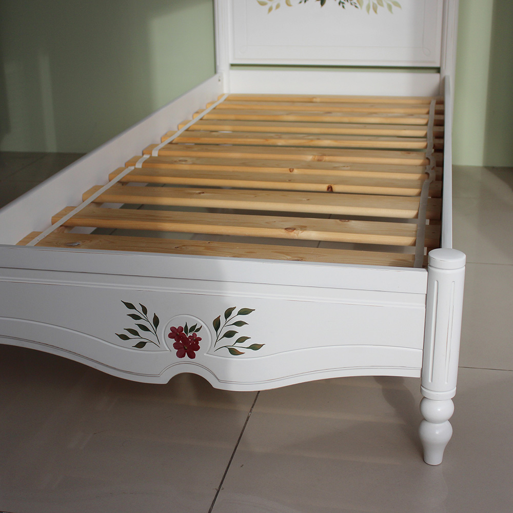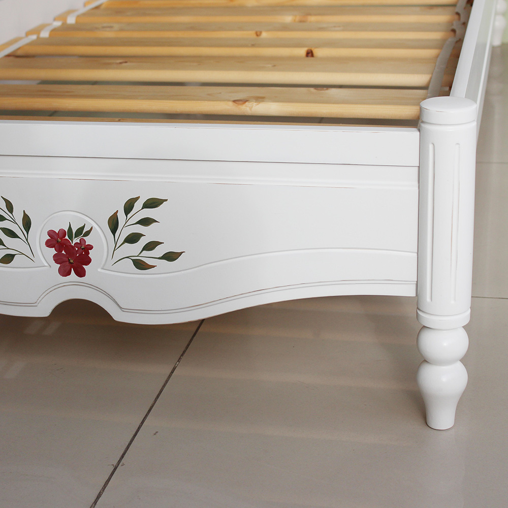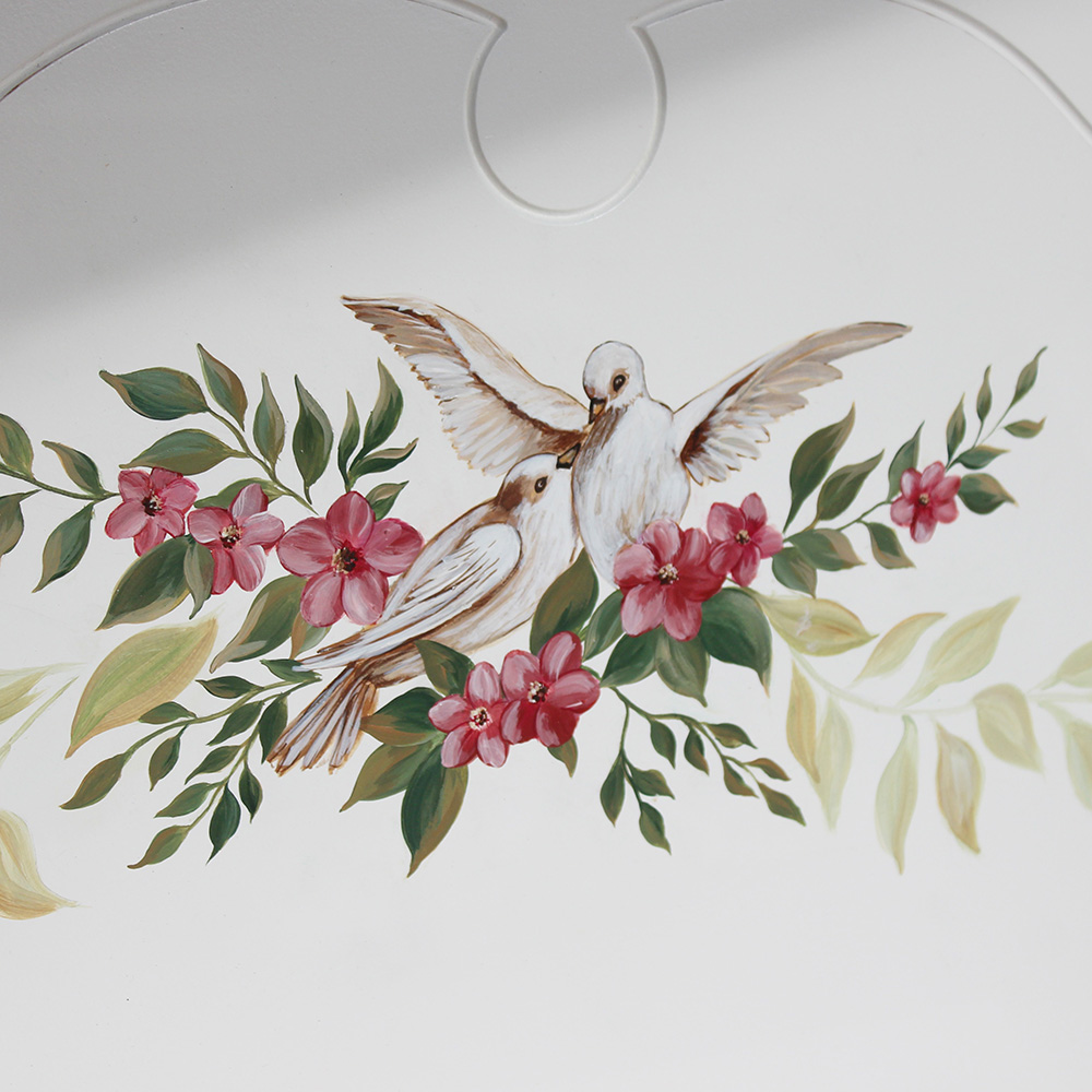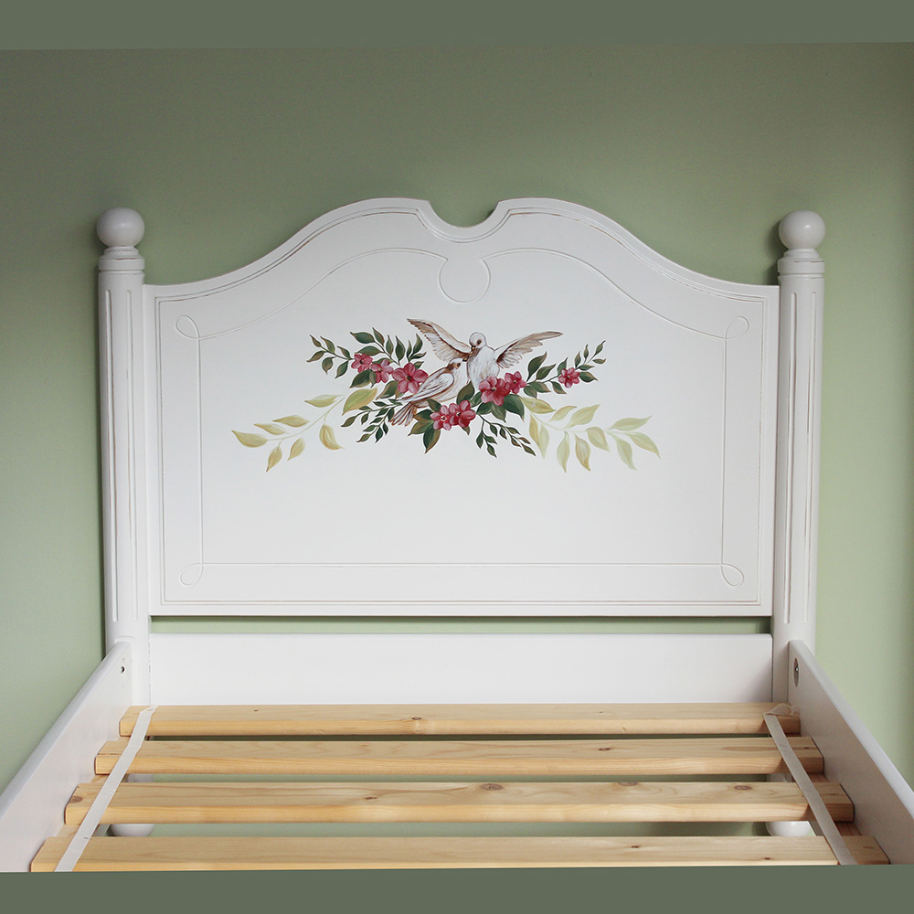 Кроватка из коллекции Бетти, выполнена из массива сосны с индивидуальным окрашиванием и росписью изголовья и изножья, а так же эффектом старения (потертости эмали до дерева, выполненные вручную). Размер спального места 800х1900 мм. Так же кроватка может быть изготовлена на заказ с другим размером и (или) рисунком и цветом.