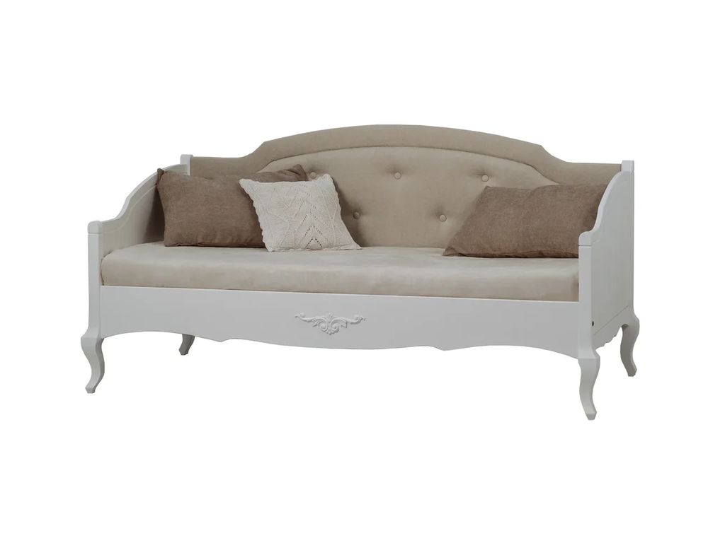 Цвет тахты на титульной фотографии — скандик белый. Стоимость зависит от выбранного покрытия.