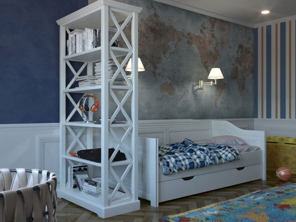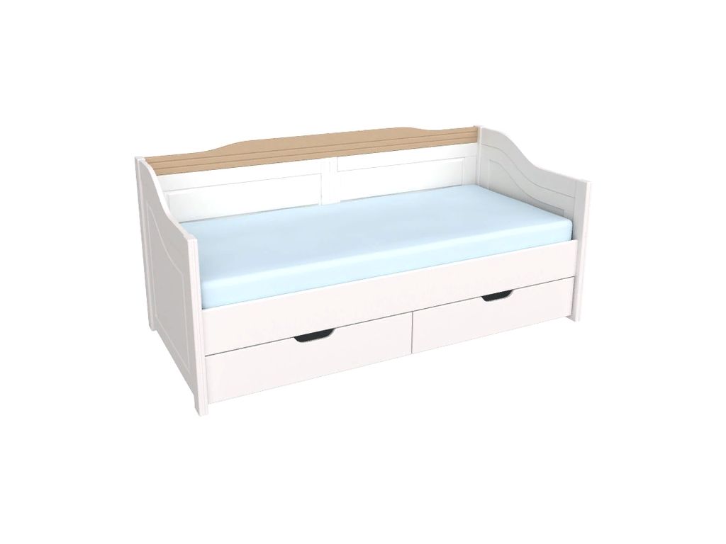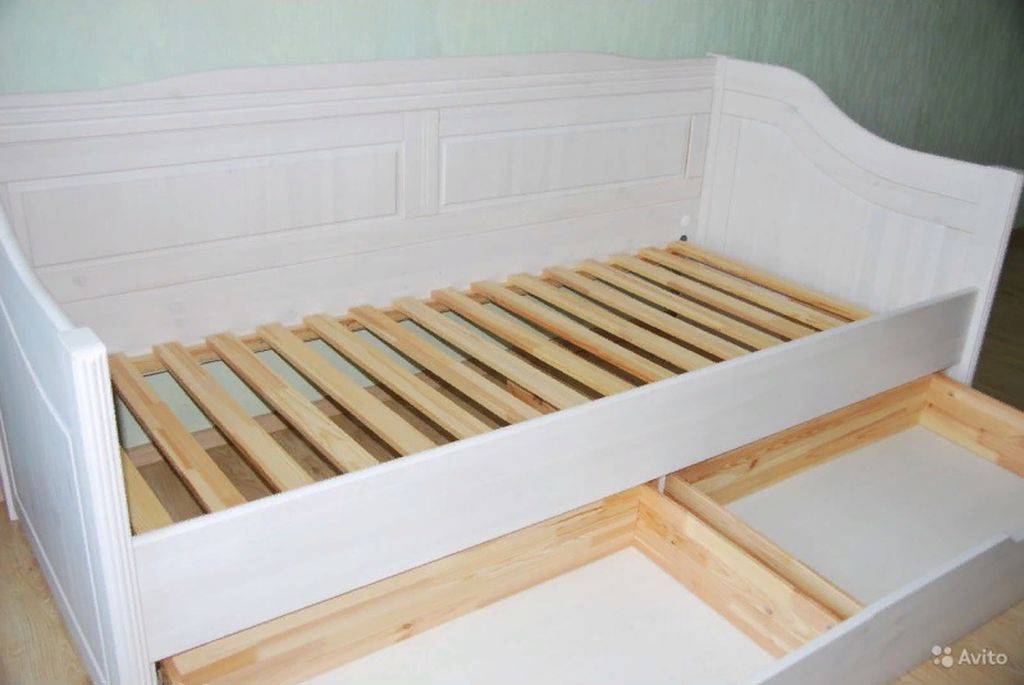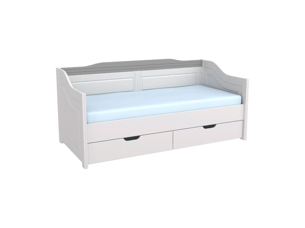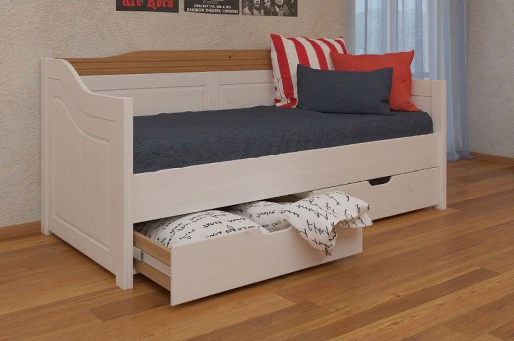 Описание: пристенная диван-кровать, спальное место 90х200 см, боковые и пристенная спинки филенчатые, решетка из ламелей сосны в комплекте, два выдвижных ящика на шариковых направляющих полного выката.