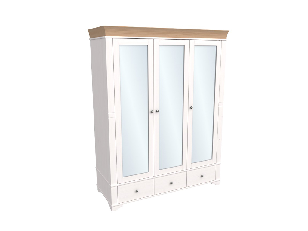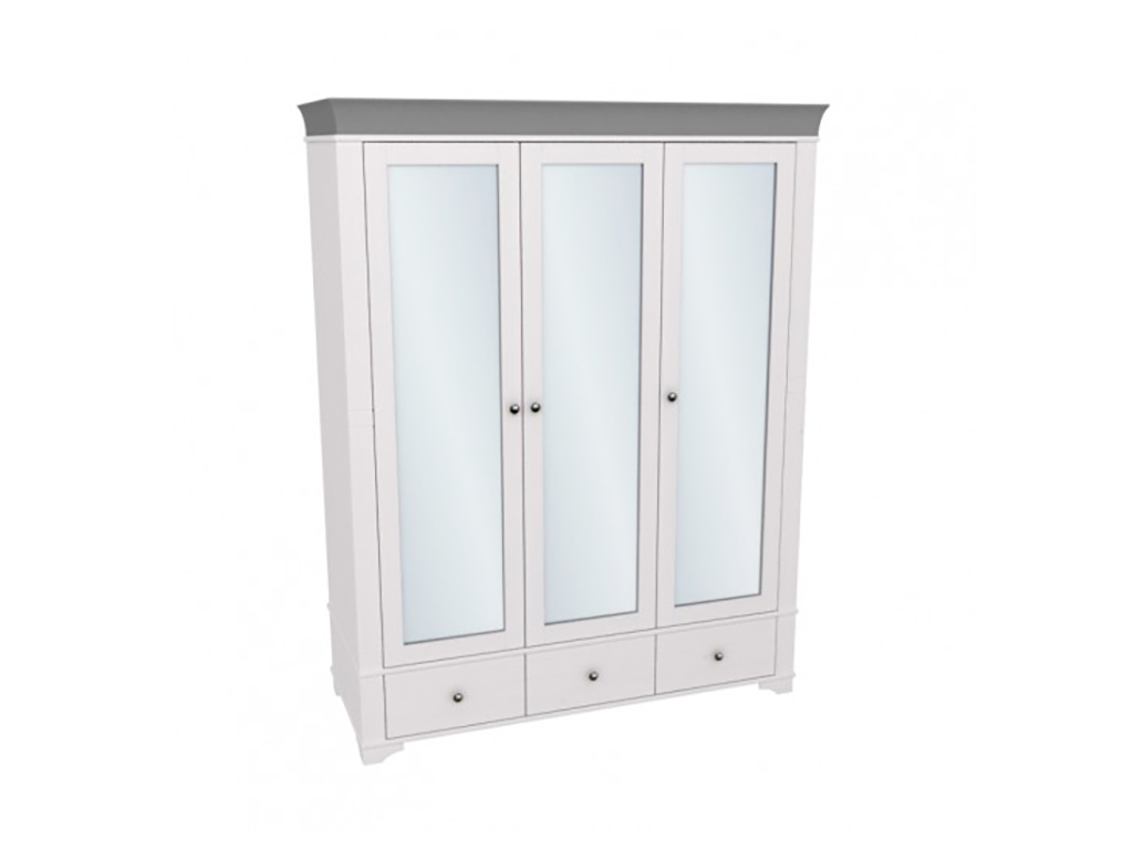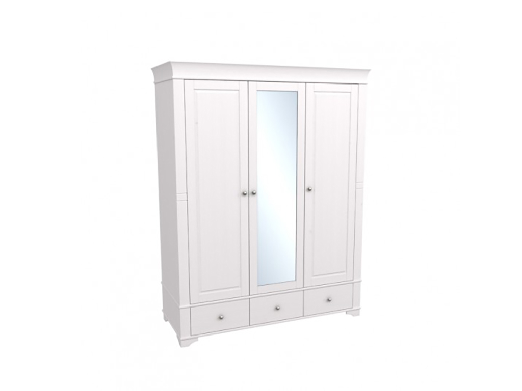 Описание: шкаф имеет 3 отделения: правое и левое отделения с филенчатой дверью с полкой и штангой под полкой, среднее отделение с зеркальной дверью имеет 3 полки, которые регулируются по высоте. Под каждой дверью имеется выдвижной ящик на роликовых направляющих. Дополнительно можно приобрести полки в левое или правое отделение.