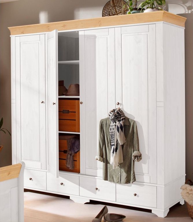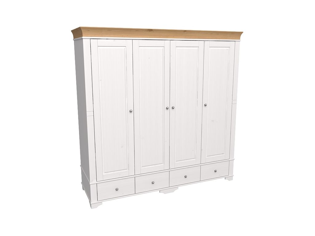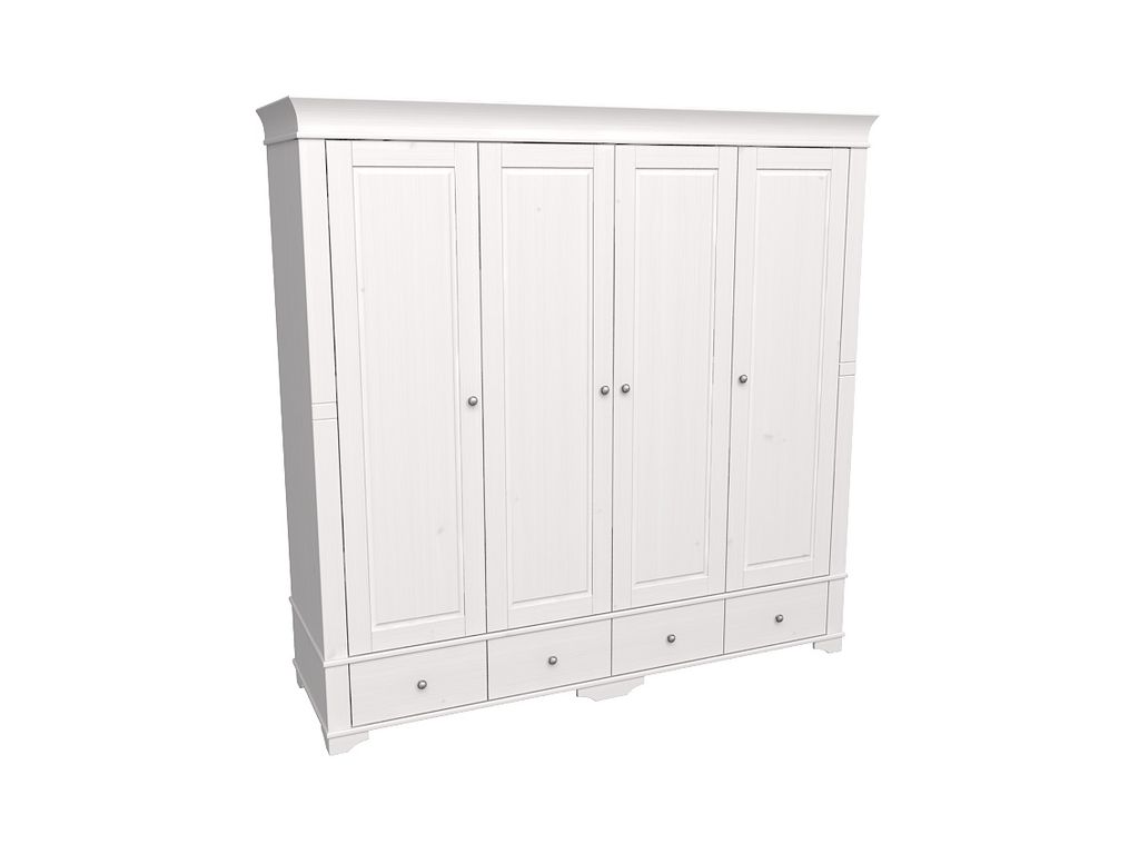 Описание: черырёхдверный шкаф с 3-мя отделениями: правое и левое отделения с полкой и штангой под ней, среднее широкое отделение имеет 3 полки, которые регулируются по высоте. Под каждой дверью имеется выдвижной ящик на роликовых направляющих.