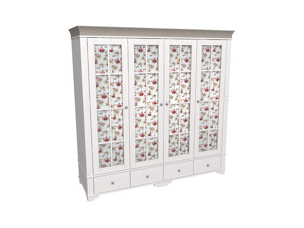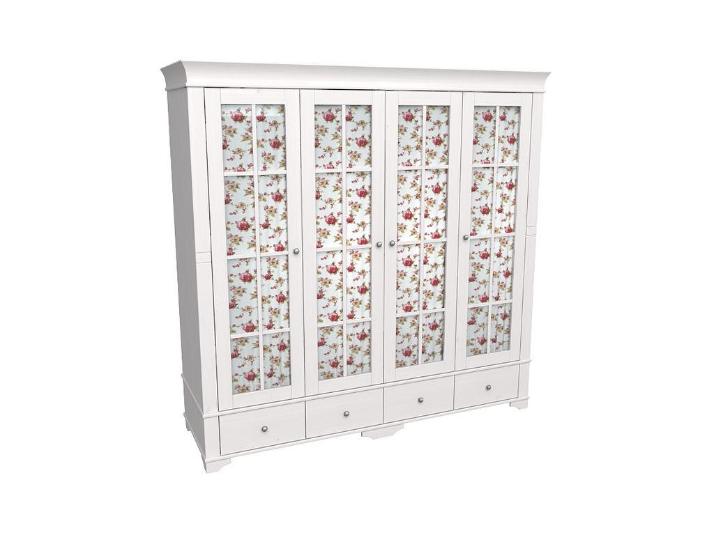 Описание: черырёхдверный шкаф с 3-мя отделениями: правое и левое отделения с полкой и штангой под ней, среднее широкое отделение имеет 3 полки, которые регулируются по высоте. Под каждой дверью имеется выдвижной ящик на роликовых направляющих. Шторы в комплект не входят и приобретаются отдельно.