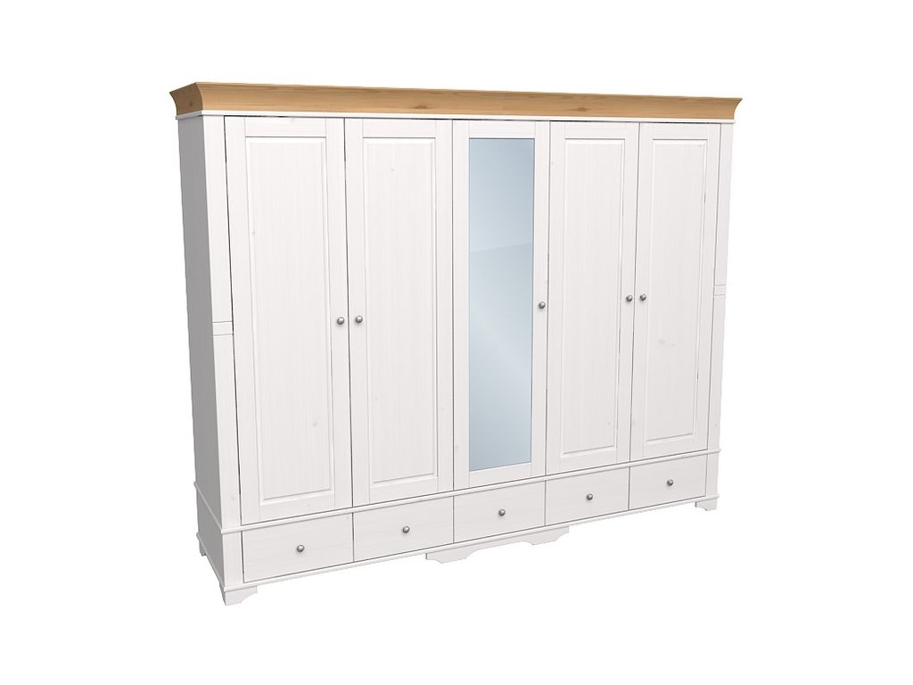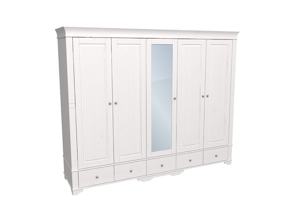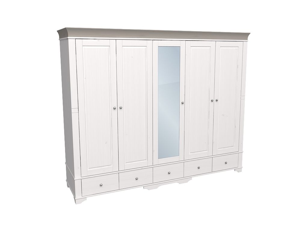 Описание: пятидверный шкаф с 3-мя отделениями: правое и левое широкие отделения с полкой и штангой под ней, среднее широкое отделение имеет 3 полки, которые регулируются по высоте. Под каждой дверью имеется выдвижной ящик на роликовых направляющих.
