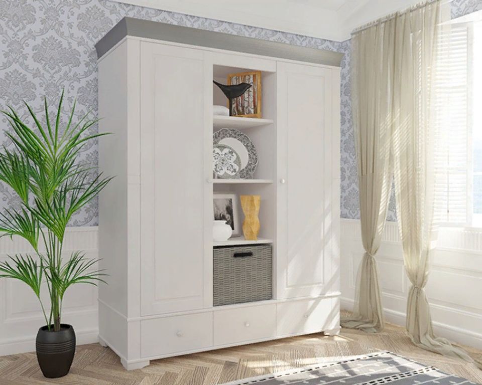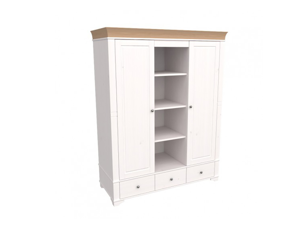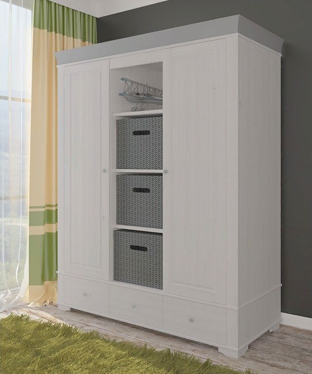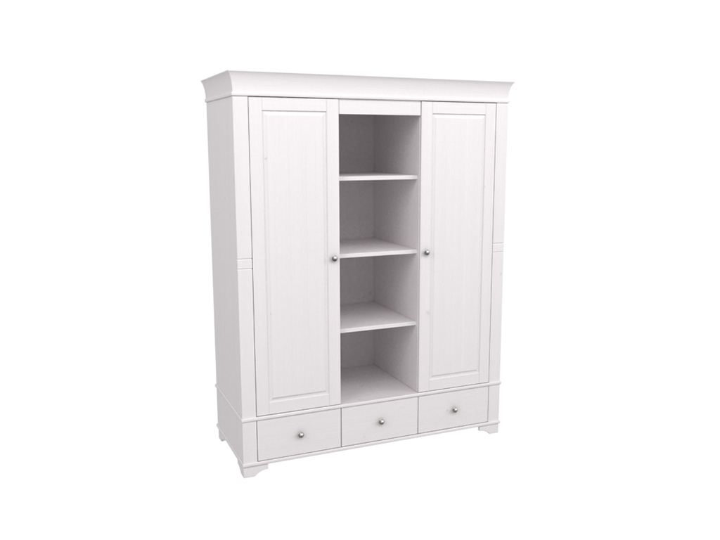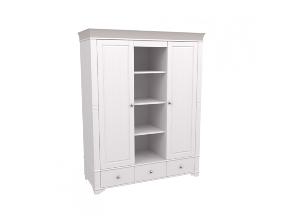 Описание: шкаф имеет 3 отделения: правое и левое отделение с полкой и штангой под ней, среднее отделение имеет 3 полки, которые регулируются по высоте. Под каждым отделением имеется выдвижной ящик на роликовых направляющих. Дополнительно можно приобрести полки в левое или правое отделение.
