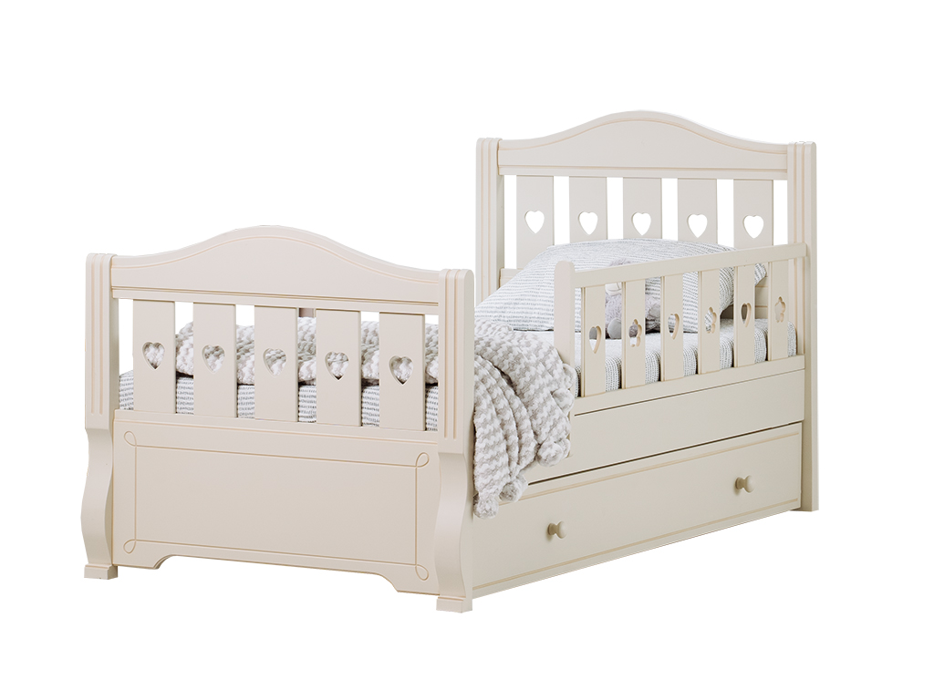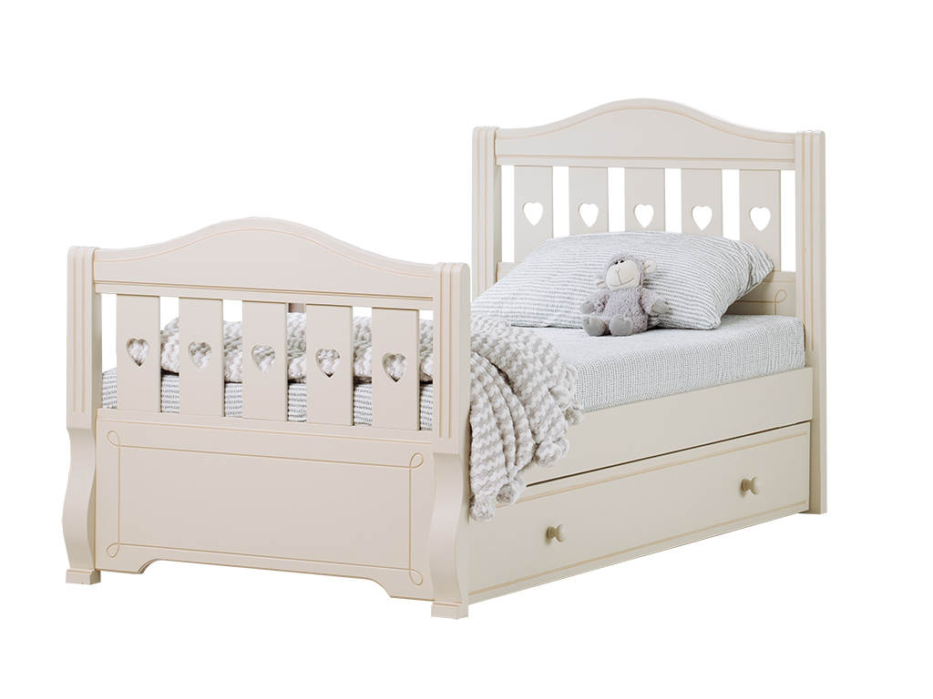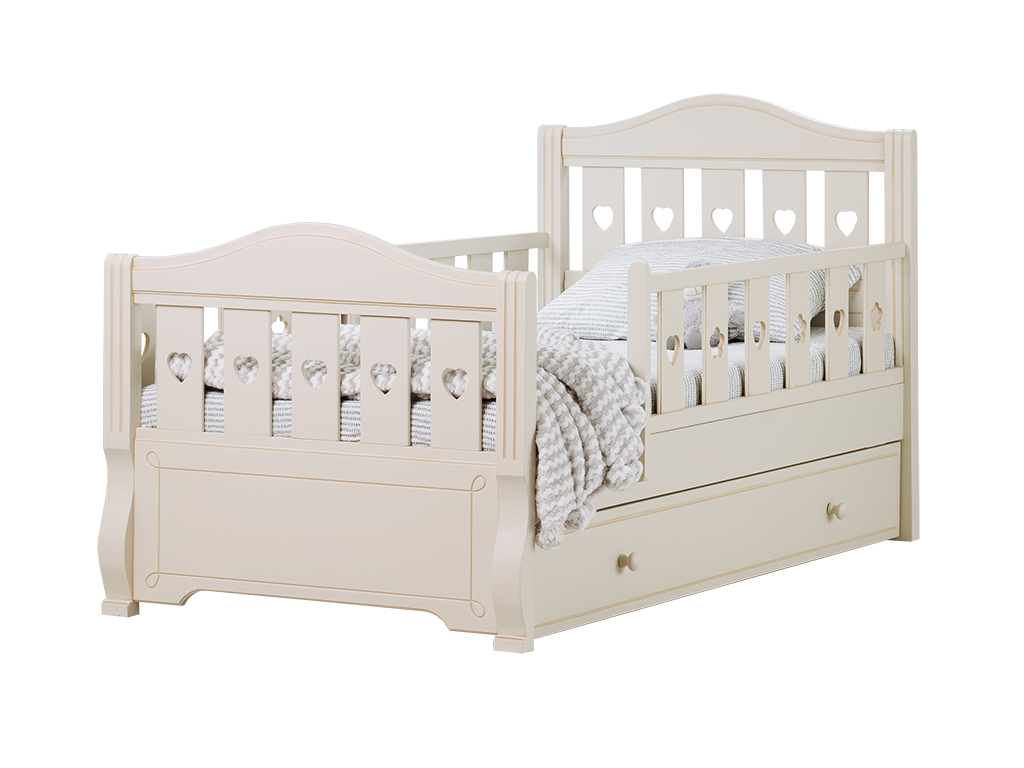 Материал - сосна, вставки изголовья, изножья - МДФ, дно ящика - ДВП.