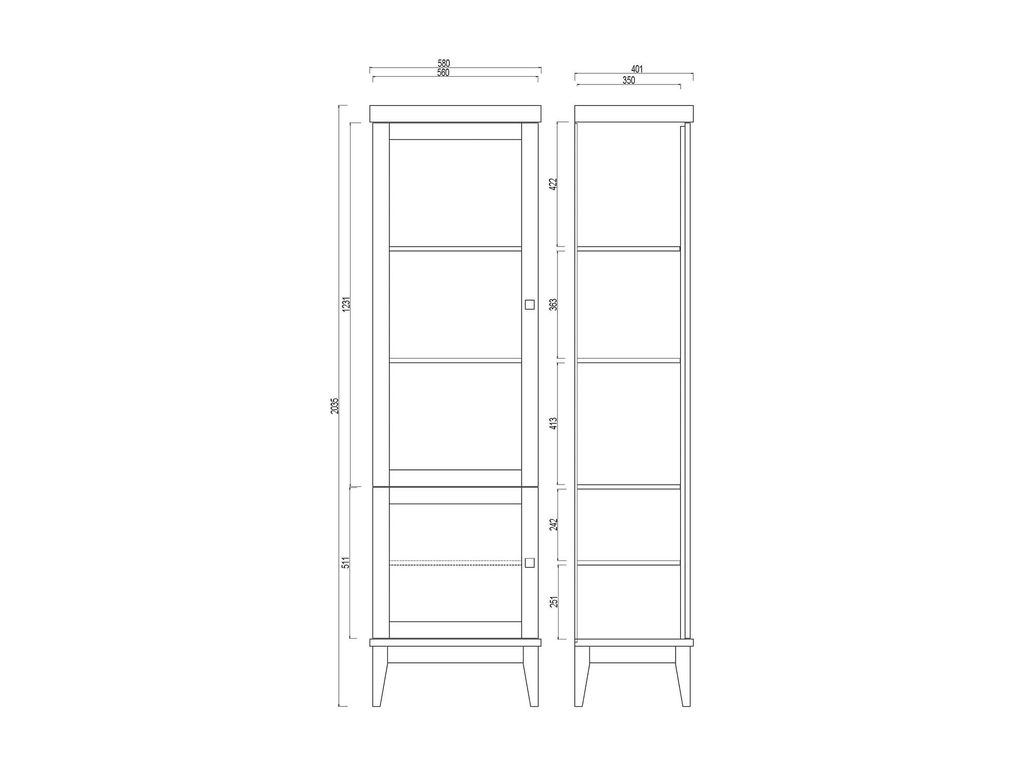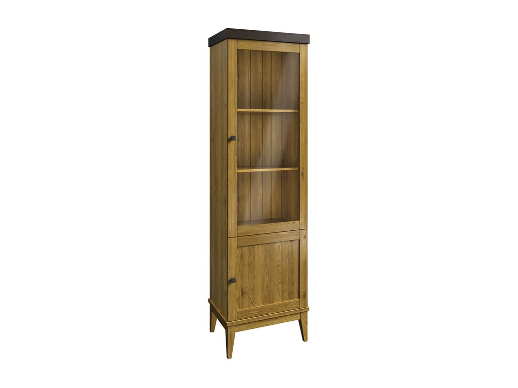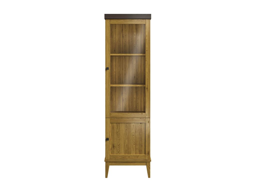Описание: высокий шкаф с распашными дверями, одна из которых со стеклом.