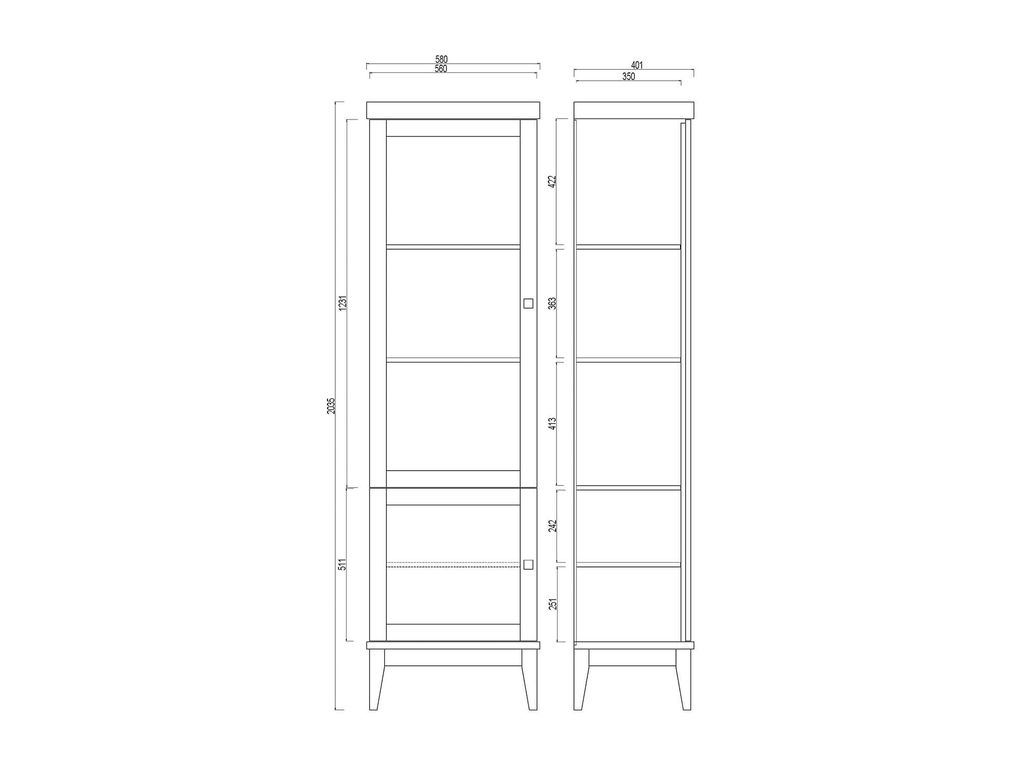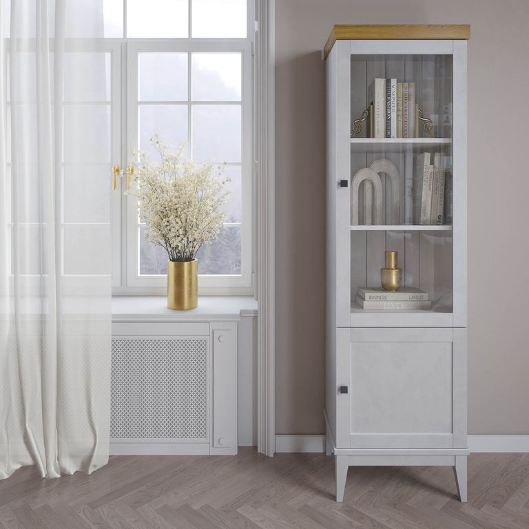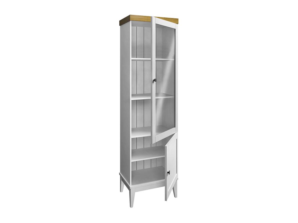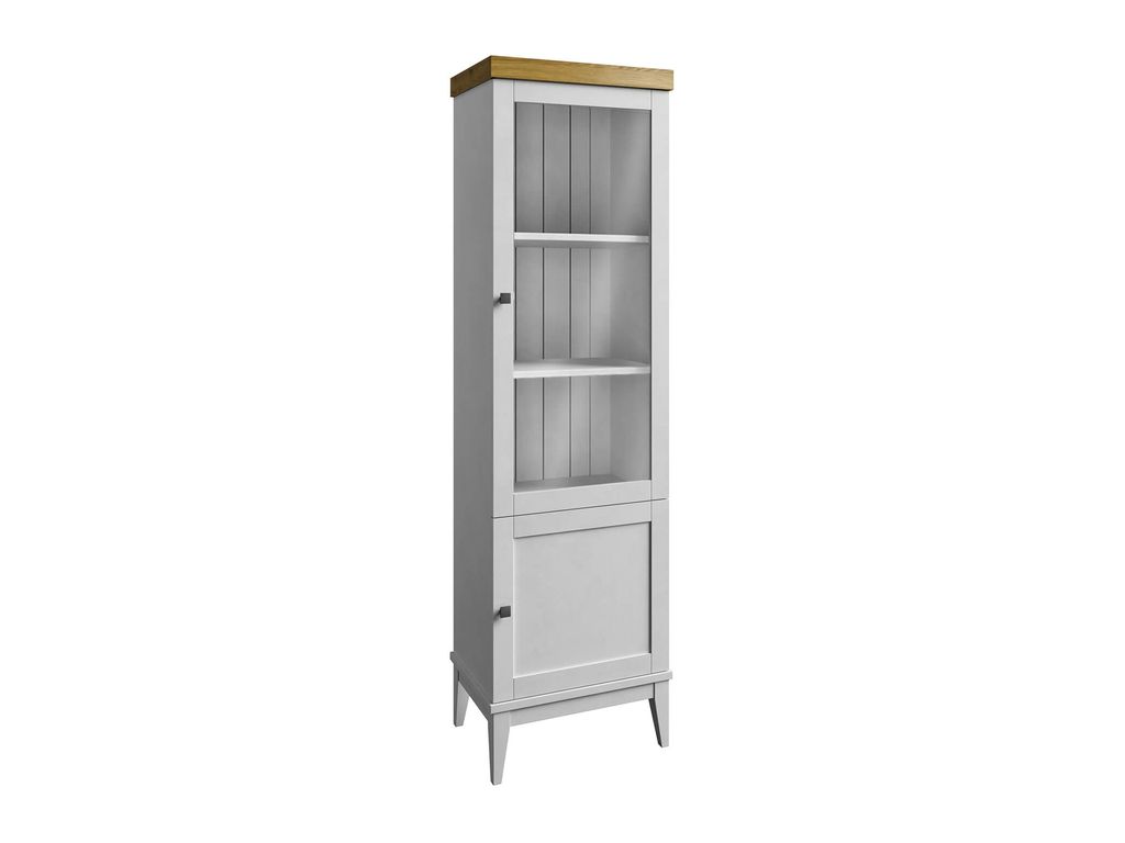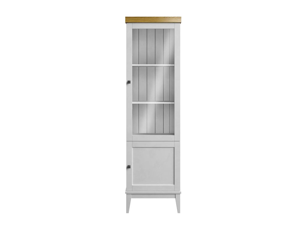 Описание: высокий шкаф с распашными дверями, одна из которых со стеклом.