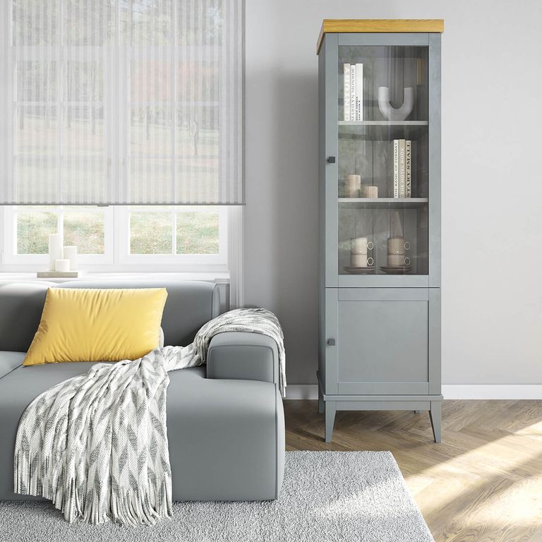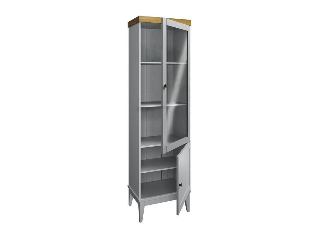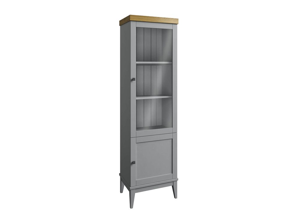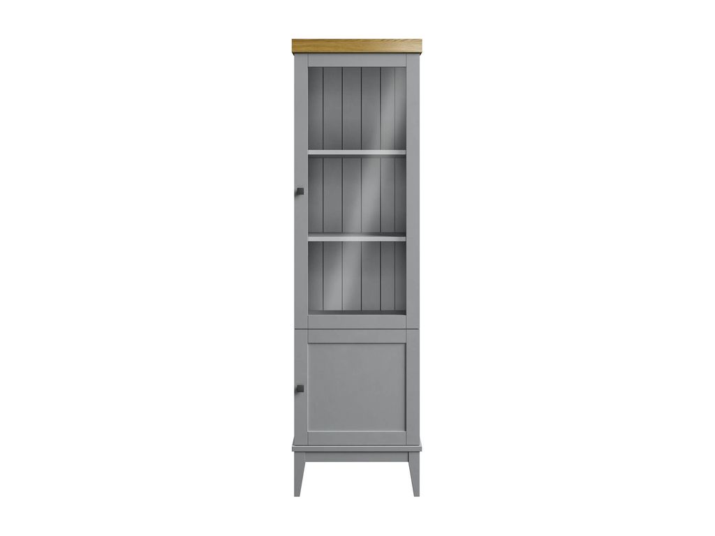 Описание: высокий шкаф с распашными дверями, одна из которых со стеклом.