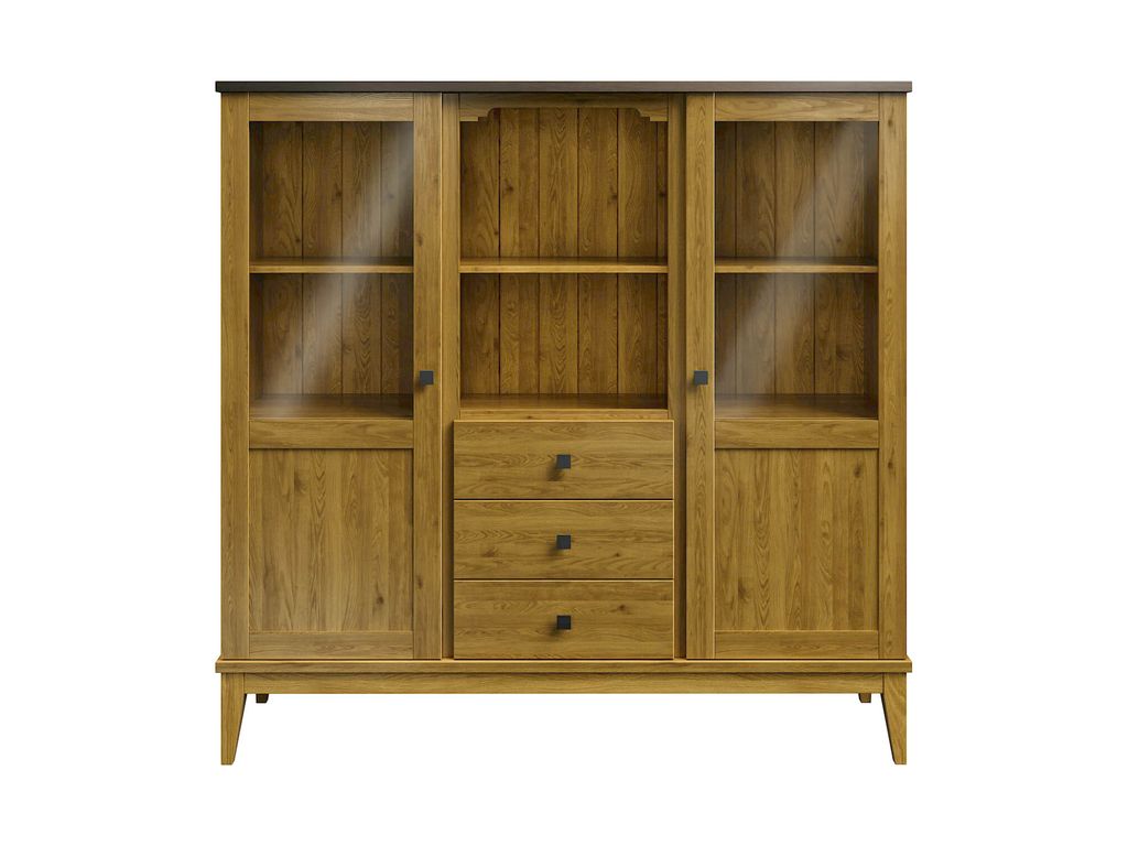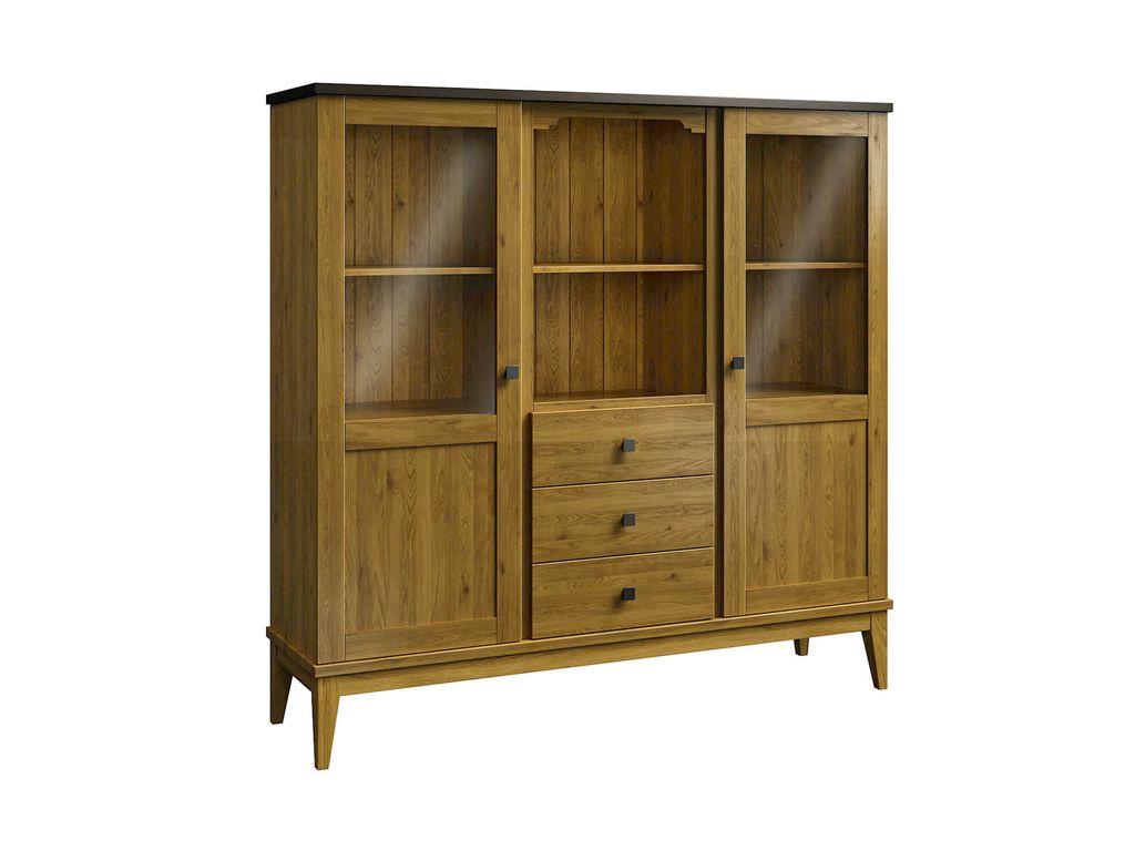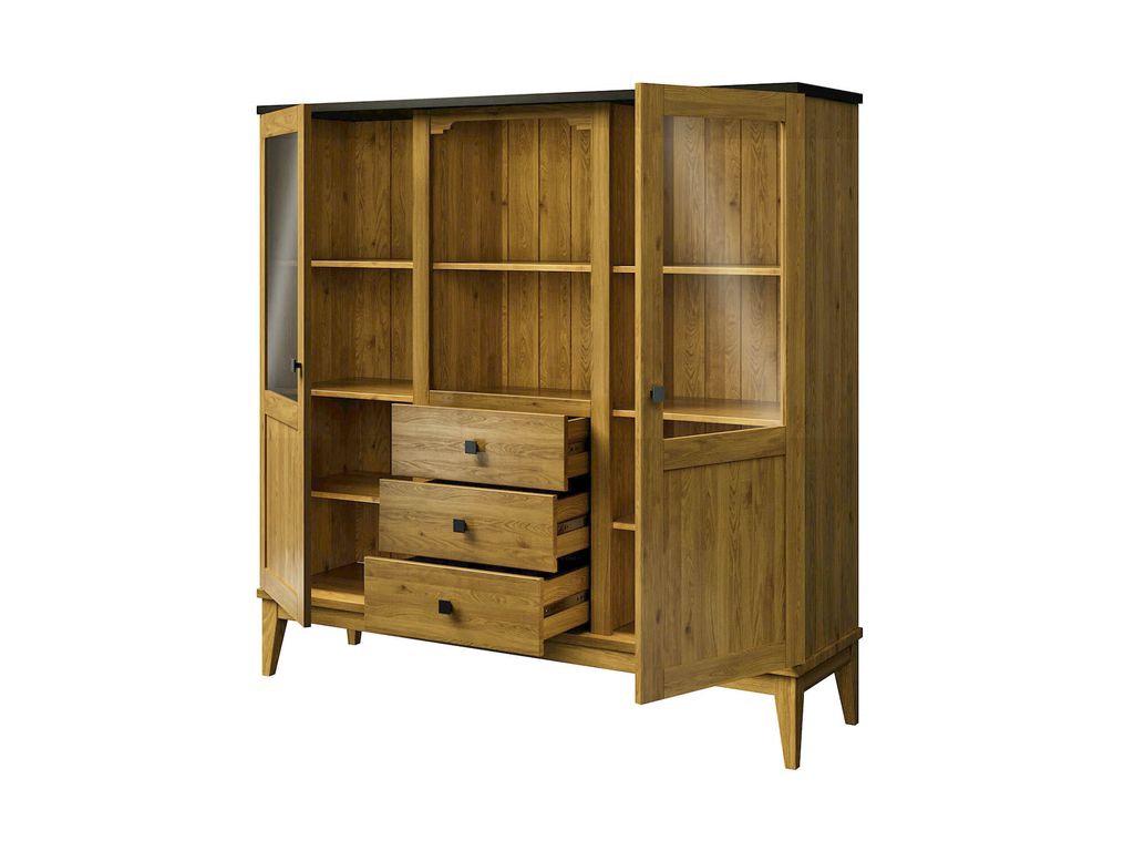 Описание: высокий шкаф с распашными стеклянными дверями. В нижней части имеются три выдвижных ящика полного выдвижения на телескопических направляющих.