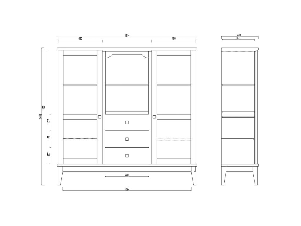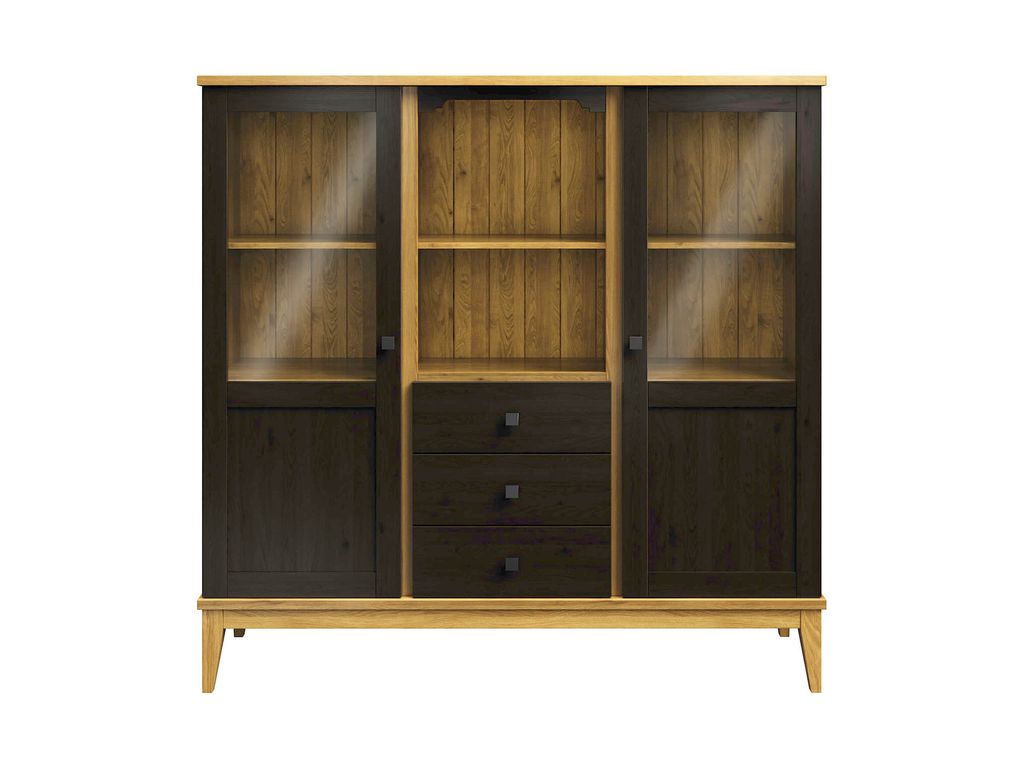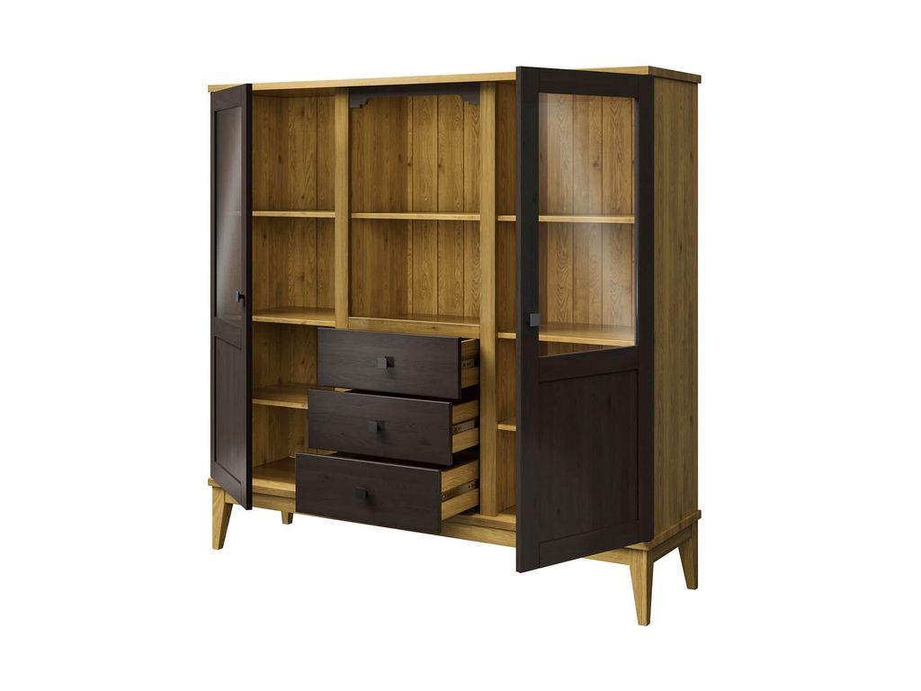 Описание: высокий шкаф с распашными стеклянными дверями. В нижней части имеются три выдвижных ящика полного выдвижения на телескопических направляющих.