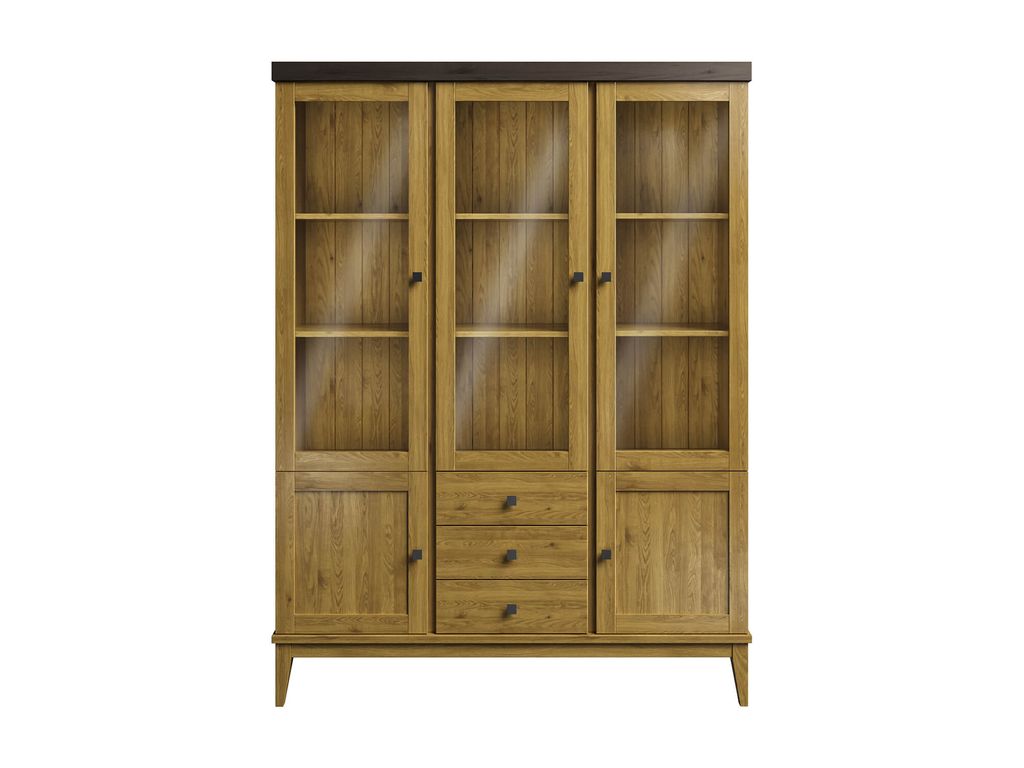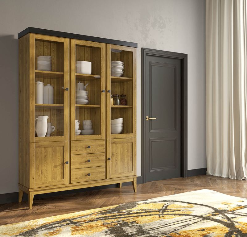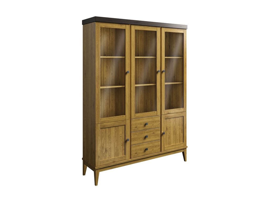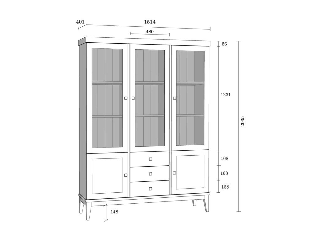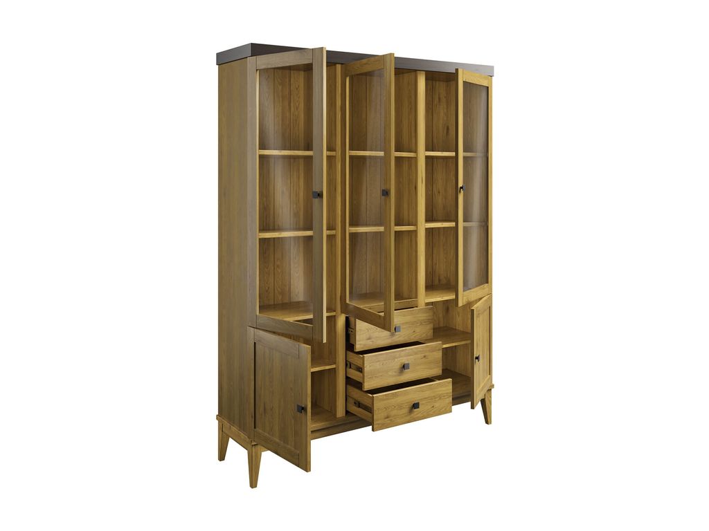 Описание: представляет собой высокий шкаф с тремя распашными стеклянными дверями сверху, двумя филенчатыми дверками снизу и тремя выдвижными ящиками.