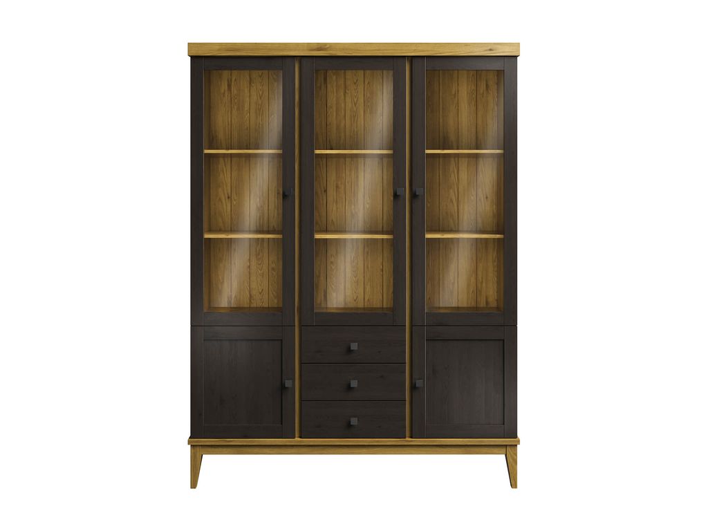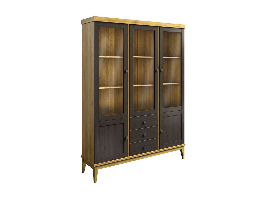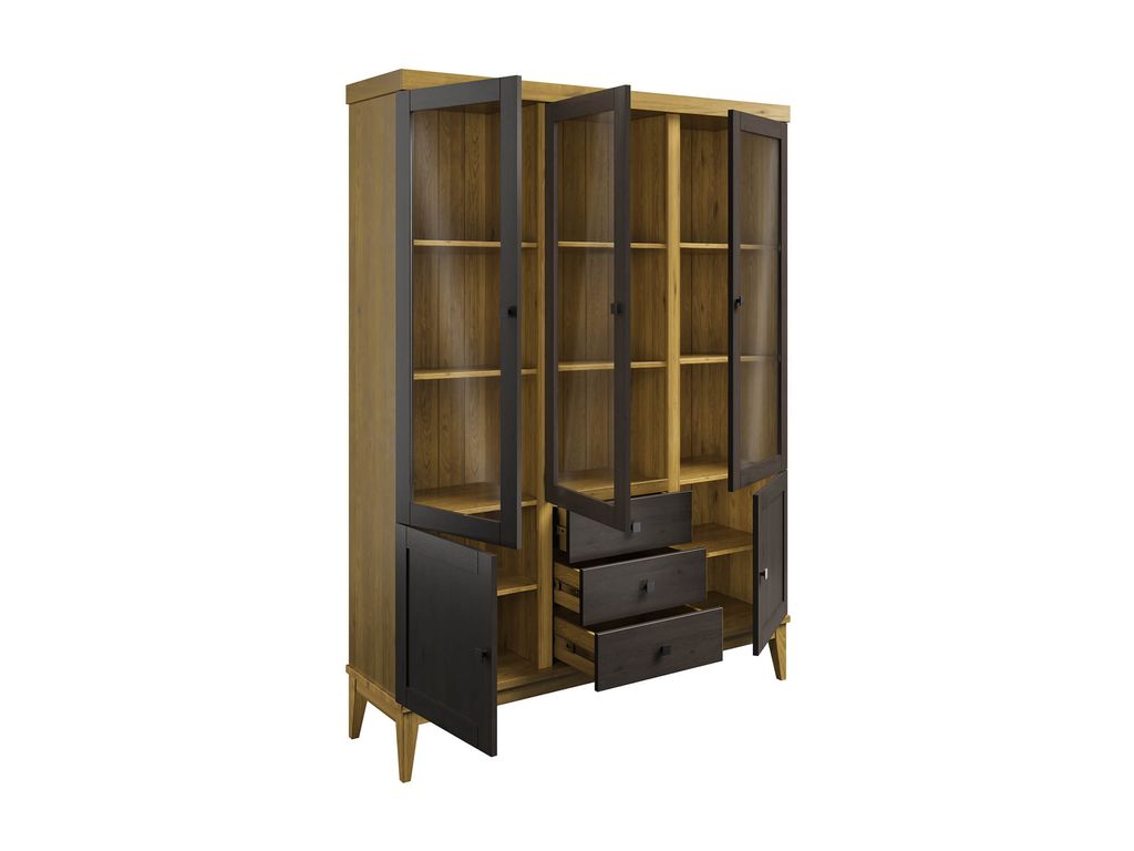Описание: представляет собой высокий шкаф с тремя распашными стеклянными дверями сверху, двумя филенчатыми дверками снизу и тремя выдвижными ящиками.