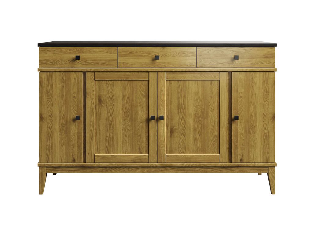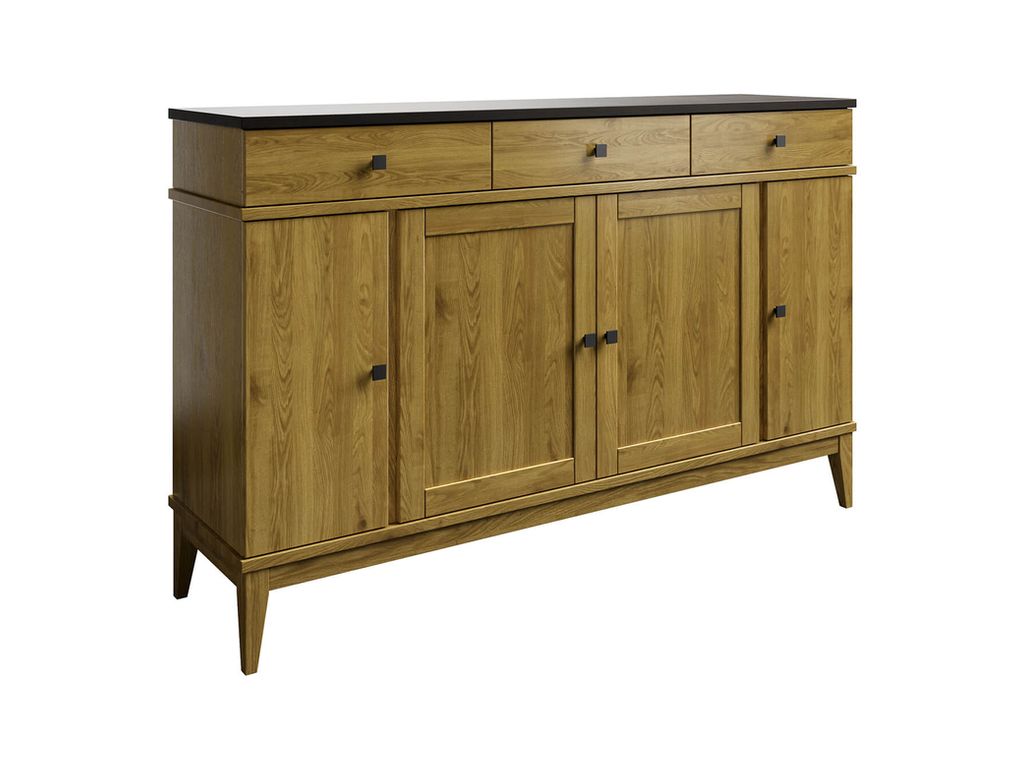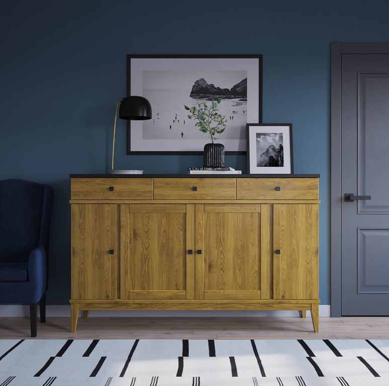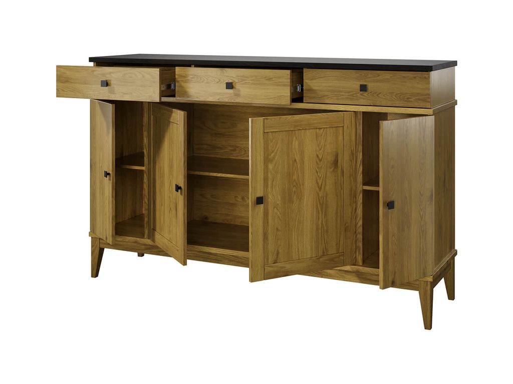 Описание: тумба с тремя ящиками вверху и тремя полками за распашными дверями. Выдвижные ящики полного выдвижения на телескопических направляющих.