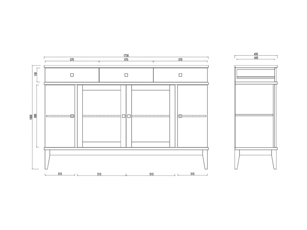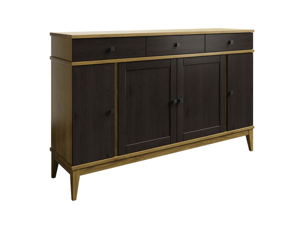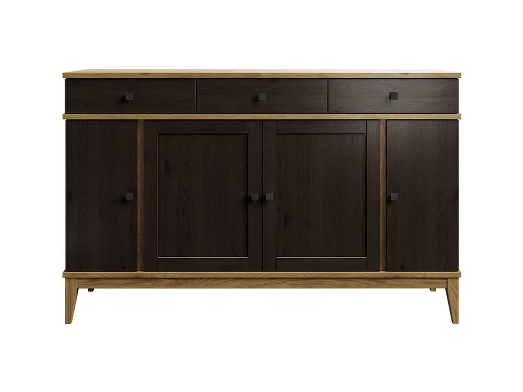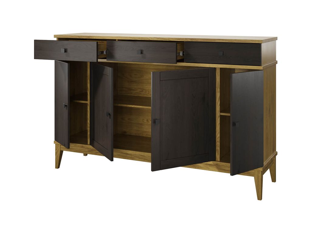 Описание: тумба с тремя ящиками вверху и тремя полками за распашными дверями. Выдвижные ящики полного выдвижения на телескопических направляющих.