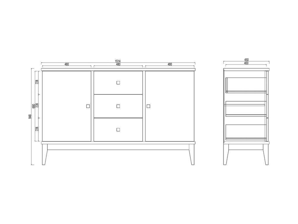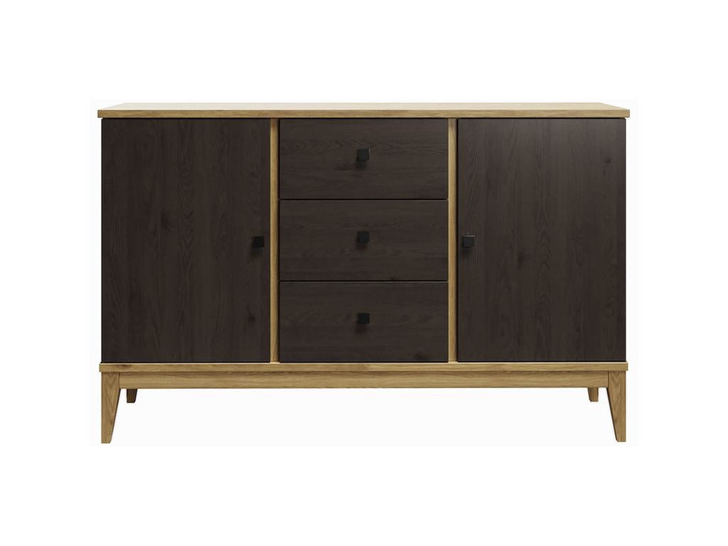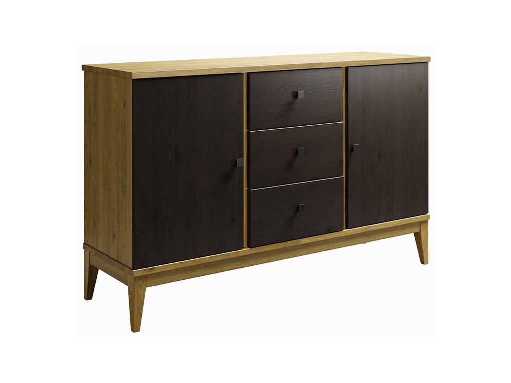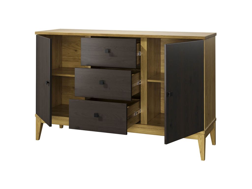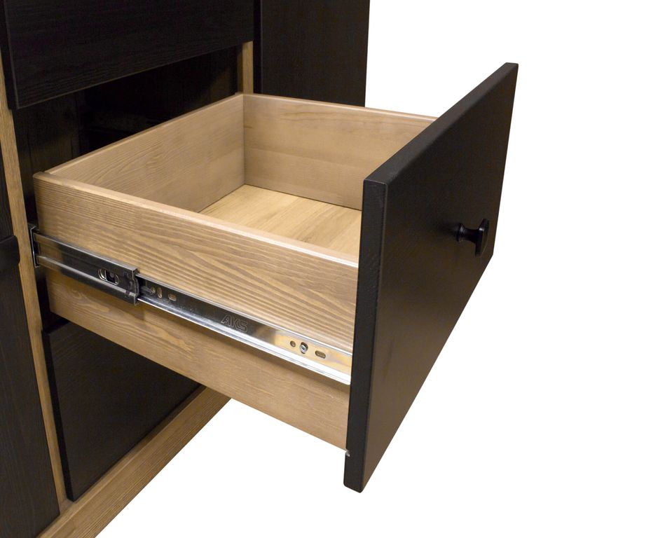 Описание: тумба с тремя ящиками посередине и двумя полками за распашными дверями. Выдвижные ящики полного выдвижения на телескопических направляющих.