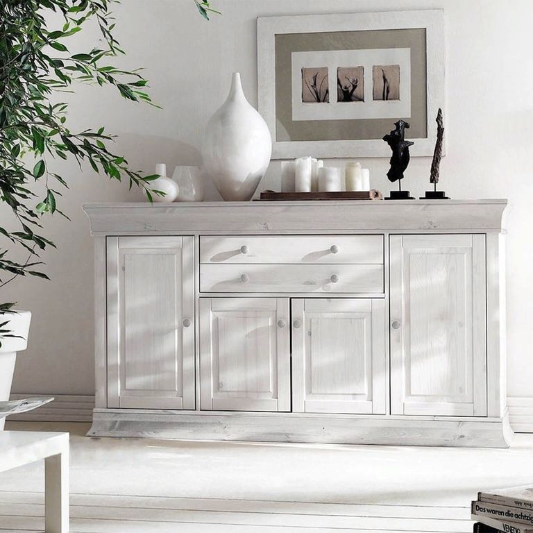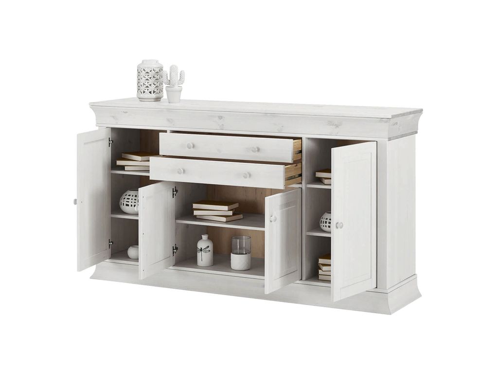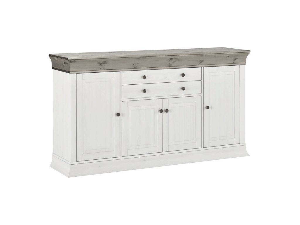 Описание: комод Бостон - внушительное и многофункциональное изделие. На широкой столешнице можно установить бытовую технику или необходимые вещи. Четыре отделения с полками оснащены распашными дверями, в верхней части также находятся пара выдвижных ящиков на металлических направляющих.