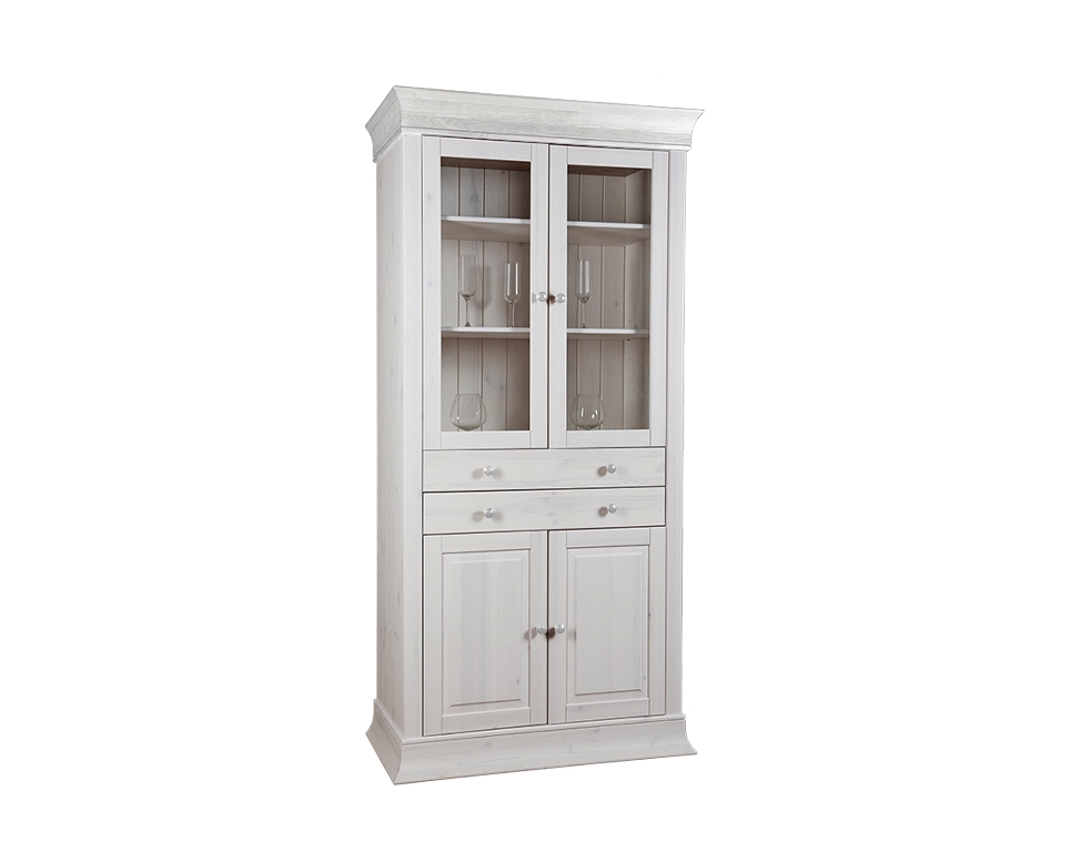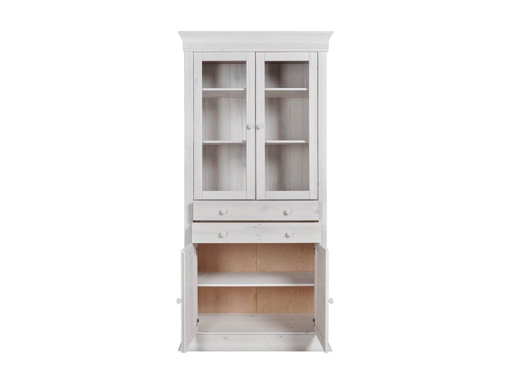 Описание: шкаф Бостон предназначен в первую очередь для кухни или столовой. Сверху находится витрина для хранения посуды, под ней - два выдвижных ящика, куда можно сложить ложки, вилки и другие мелочи. Внизу за навесными дверями еще две полки для более громоздкой утвари: бытовой техники или кастрюль.