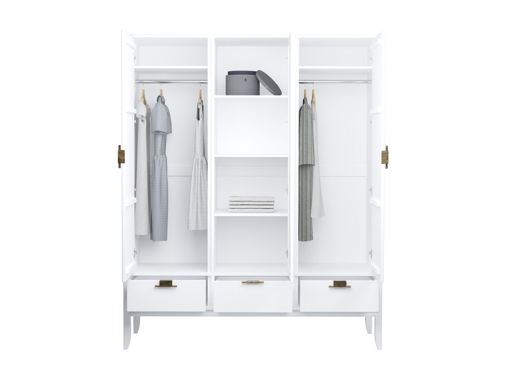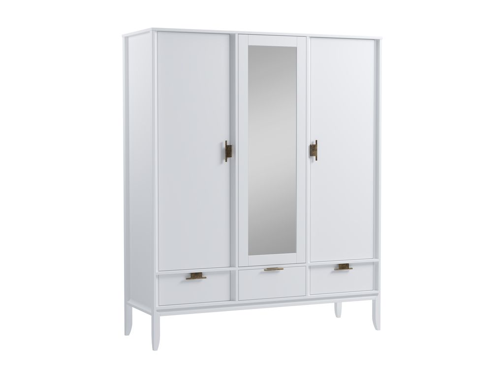 Описание: шкаф имеет 3 отделения: правое и левое отделения с полкой и штангой под ней, среднее отделение имеет 3 полки, которые регулируются по высоте. Под каждой дверью имеется выдвижной ящик на шариковых направляющих с доводчиками. Средняя дверь с зеркалом, открывается от нажатия на нее. Петли дверей с доводчиками. В правое и левое отделение можно дополнительно установить полки (продаются отдельно).