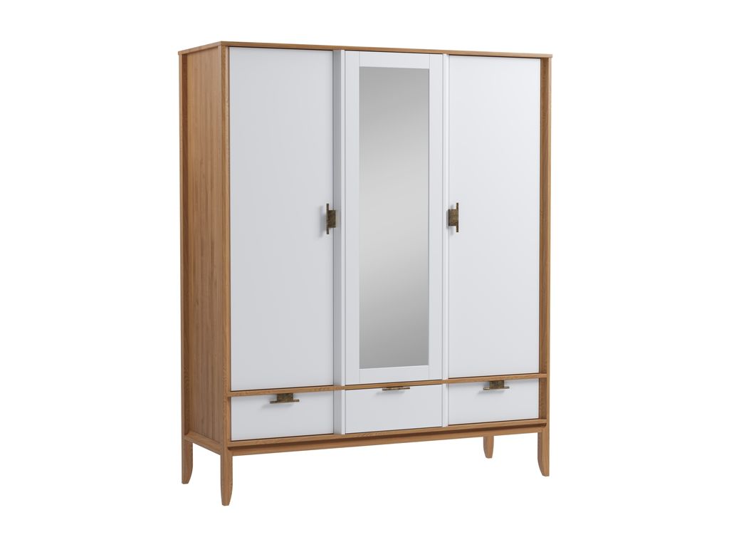 Описание: шкаф имеет 3 отделения: правое и левое отделения с полкой и штангой под ней, среднее отделение имеет 3 полки, которые регулируются по высоте. Под каждой дверью имеется выдвижной ящик на шариковых направляющих с доводчиками. Средняя дверь с зеркалом, открывается от нажатия на нее. Петли дверей с доводчиками. В правое и левое отделение можно дополнительно установить полки (продаются отдельно).