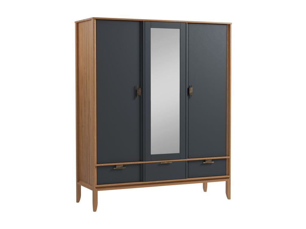 Описание: шкаф имеет 3 отделения: правое и левое отделения с полкой и штангой под ней, среднее отделение имеет 3 полки, которые регулируются по высоте. Под каждой дверью имеется выдвижной ящик на шариковых направляющих с доводчиками. Средняя дверь с зеркалом, открывается от нажатия на нее. Петли дверей с доводчиками. В правое и левое отделение можно дополнительно установить полки (продаются отдельно).