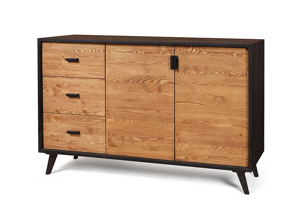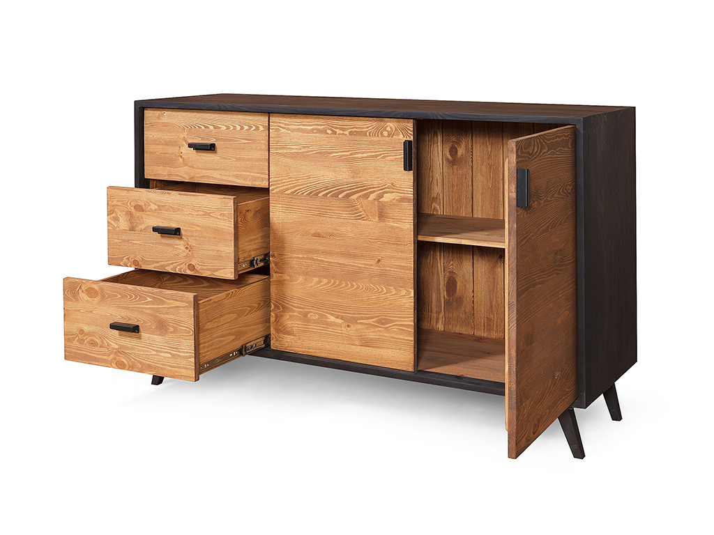 Массив сосны. Все ящики на шариковых направляющих, европетли , по-умолчанию металлические ручки, возможно изготовление без отверстий, черным цветом - нанесён чёрный матовый лак. Задние стенки и донышки ящичков - наборная вагонка, сосна. Высота ножек 15 см