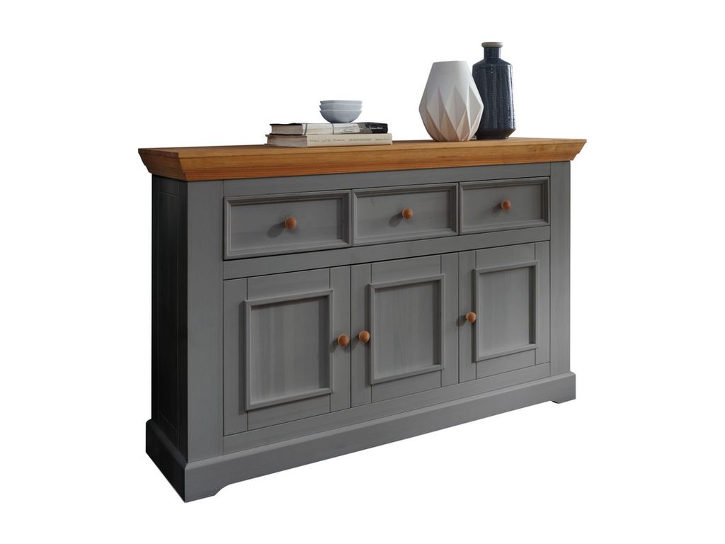 Комод имеет три ящика на роликовых направляющих и три дверки, за дверками — два отделения с полками.
