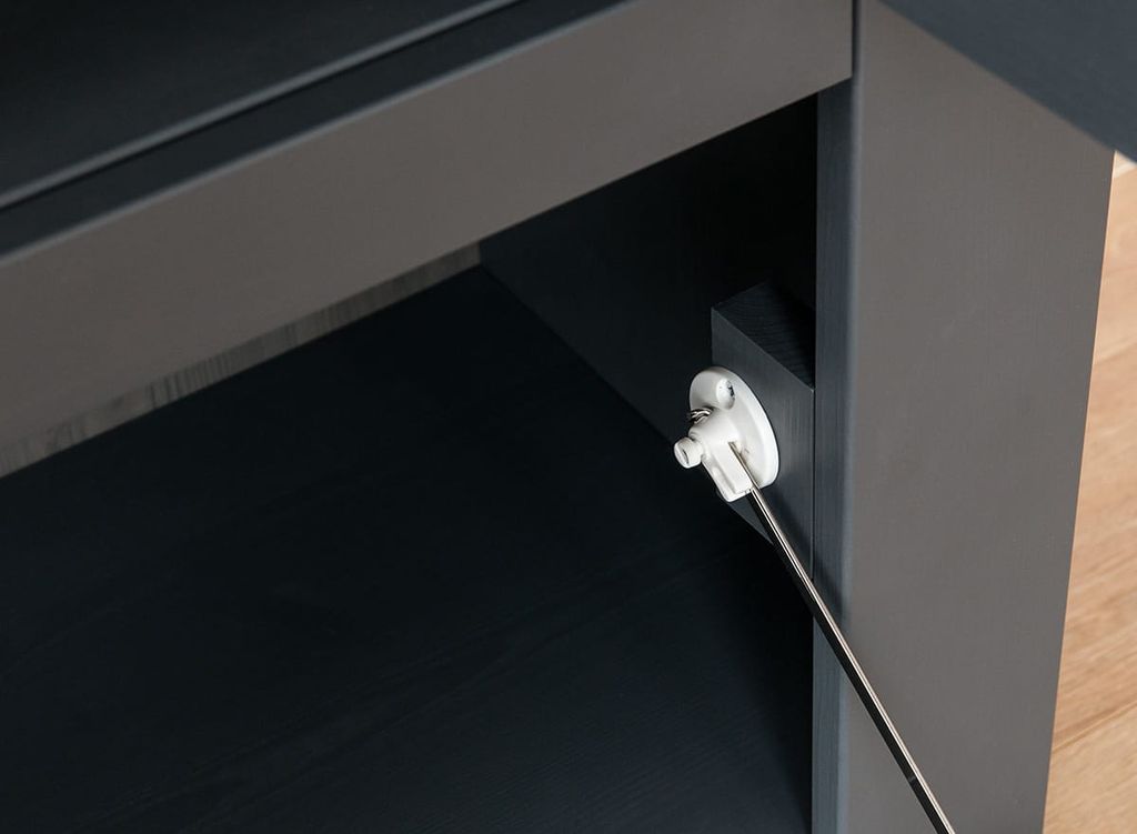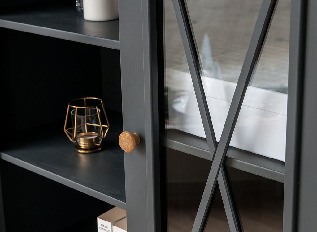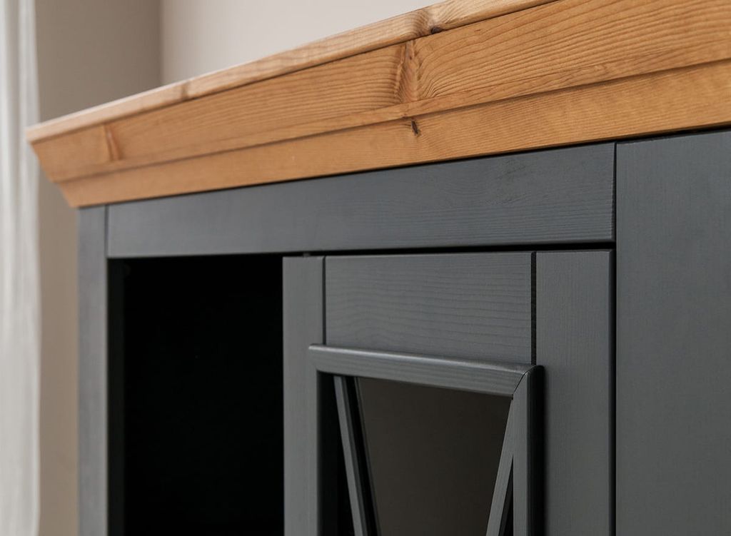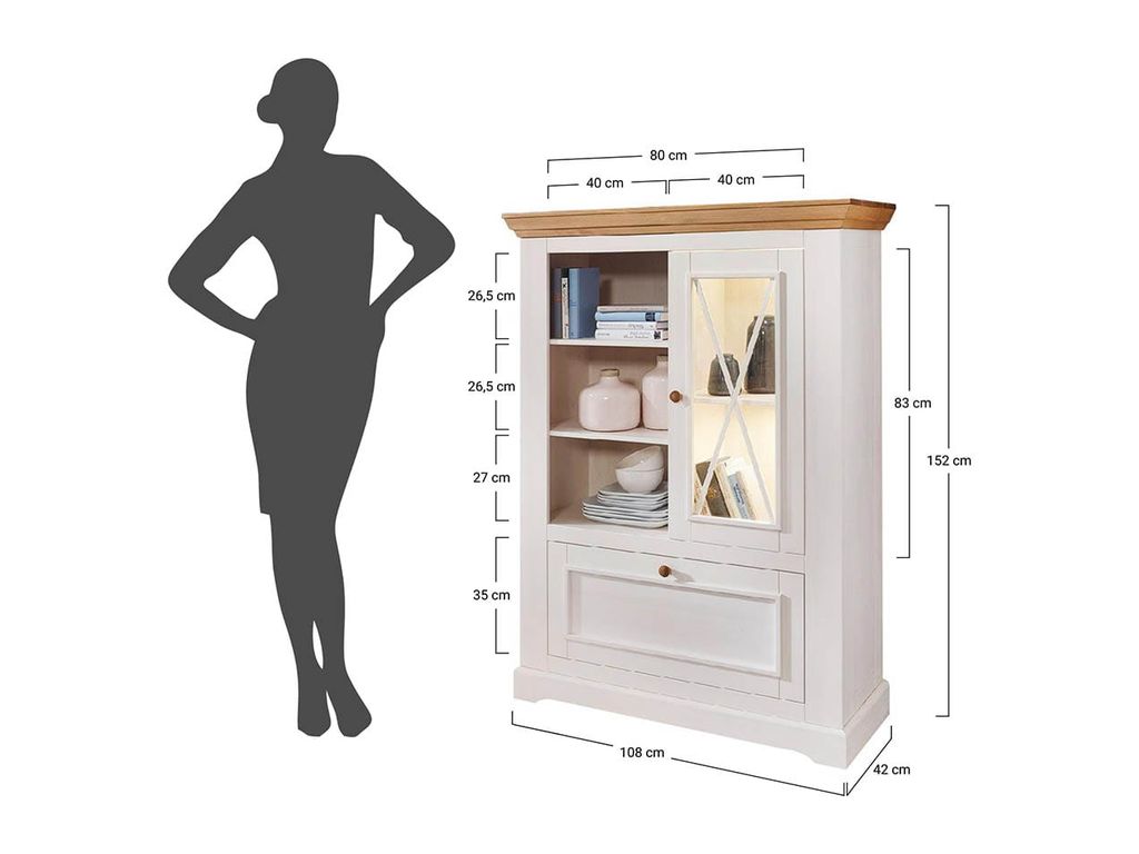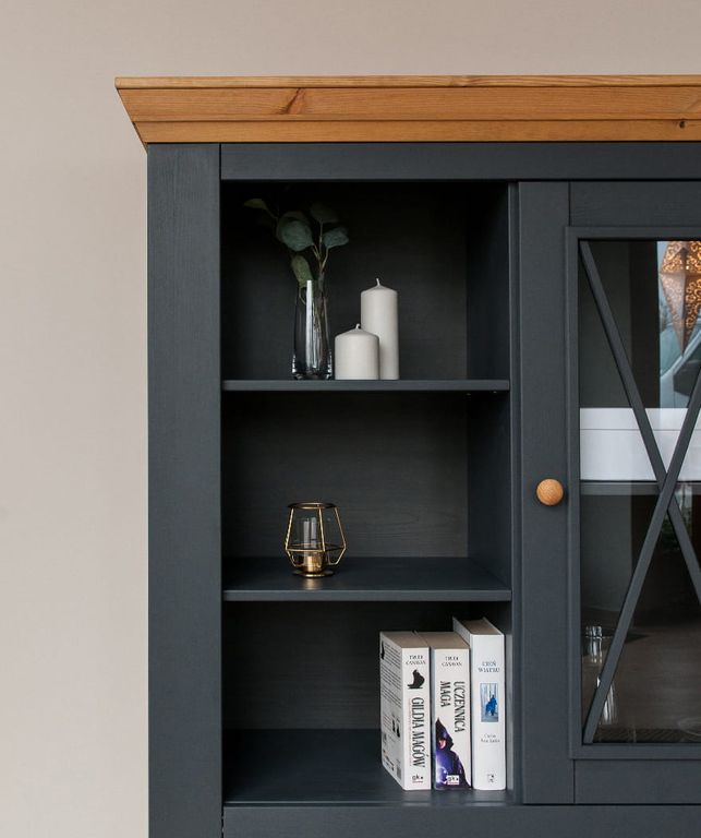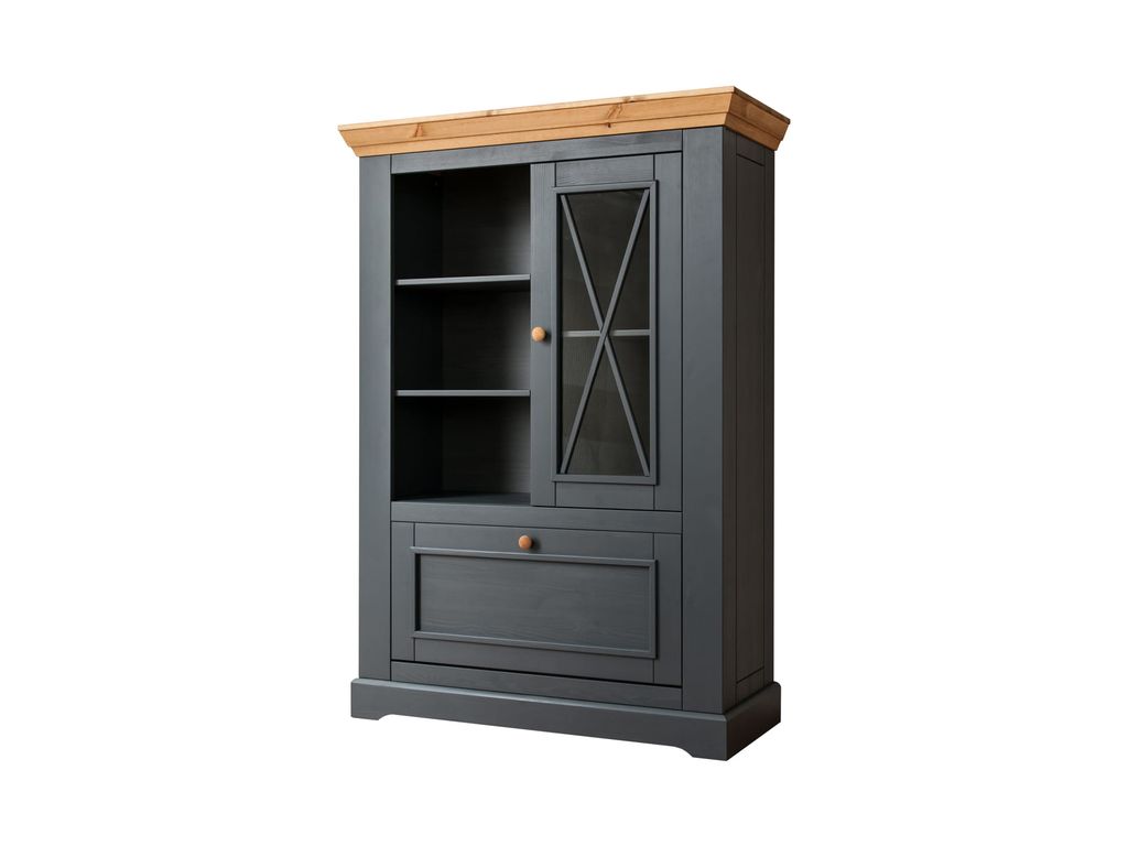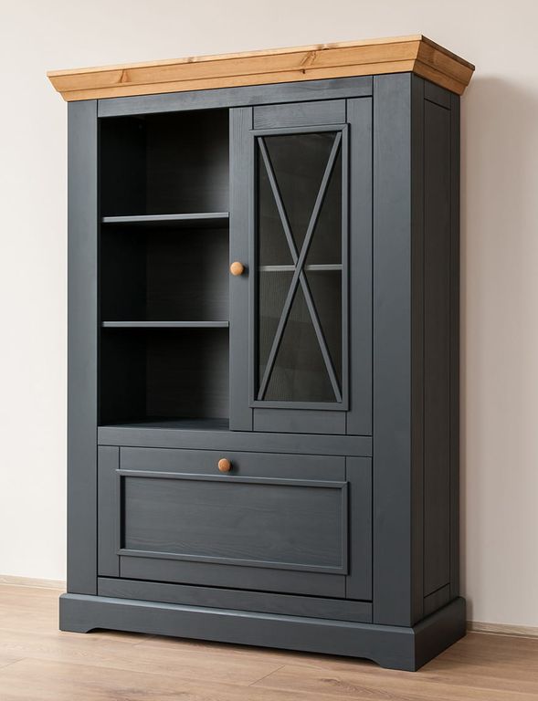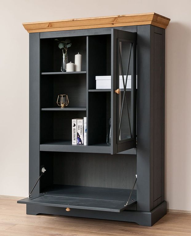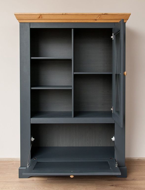 Комод имеет одну стеклянную и одну откидную дверку, за стеклянной дверкой одна деревянная полка.