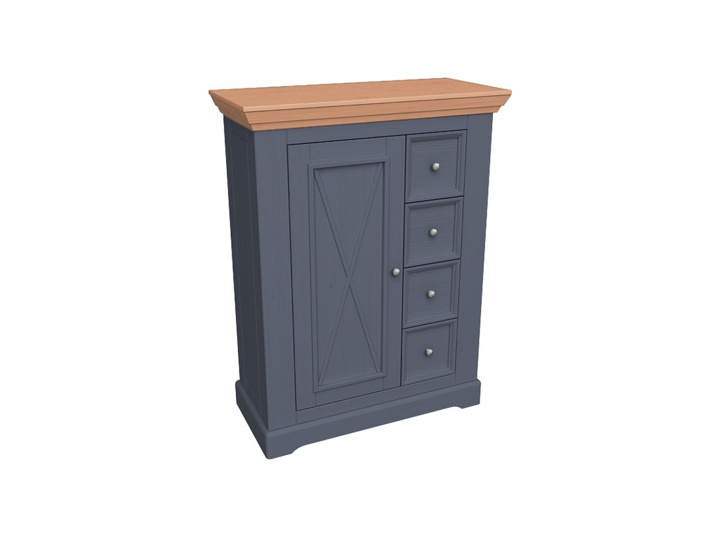 Комод имеет одну дверь и четыре выдвижных ящика на роликовых направляющих, за дверкой имеются две деревянные полки.