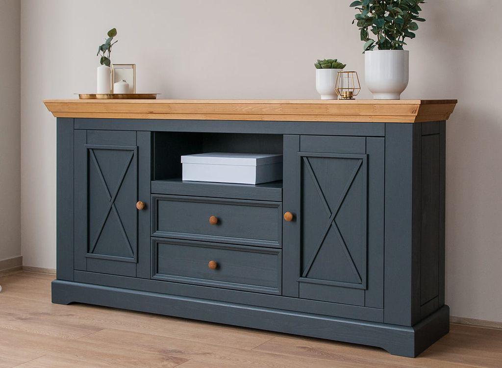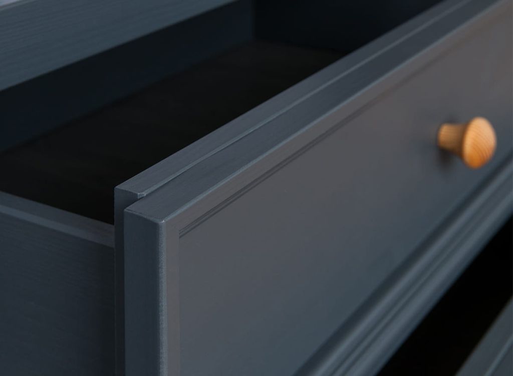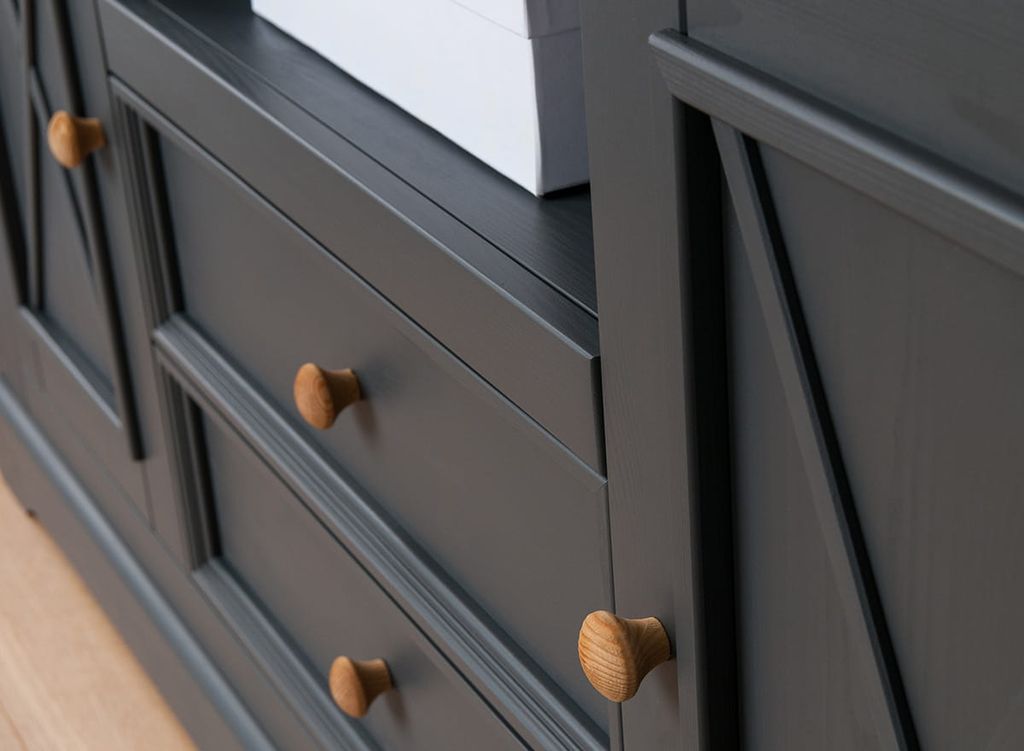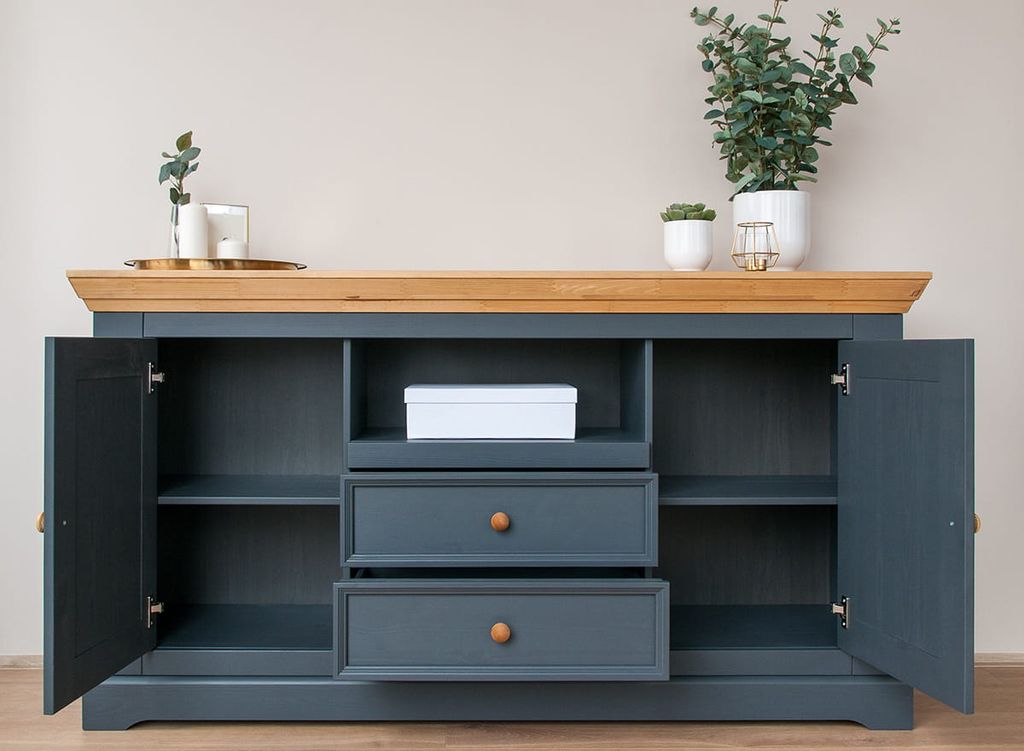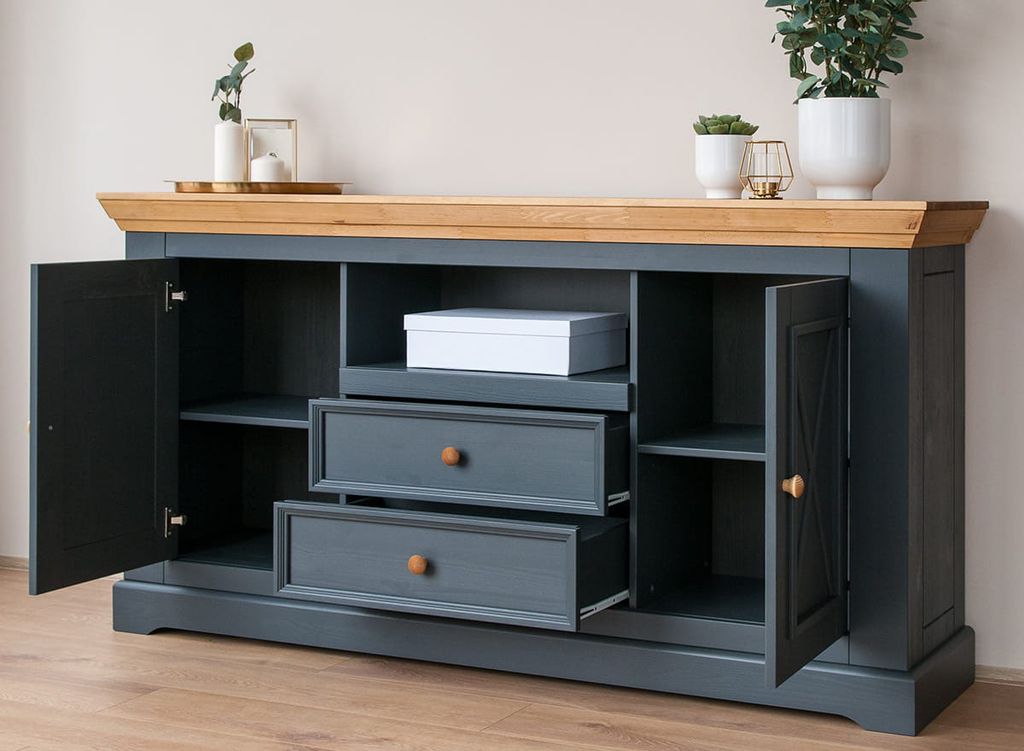 Комод имеет два выдвижных ящика на роликовых направляющих, две глухих дверки, за каждой дверкой деревянная полка.