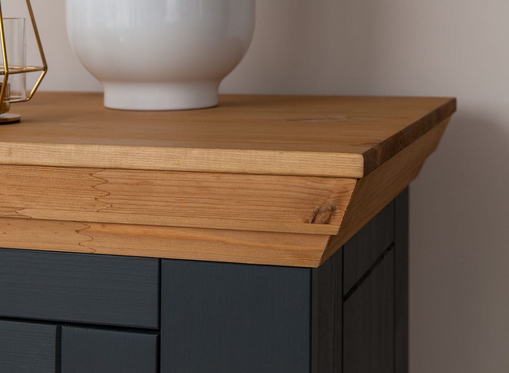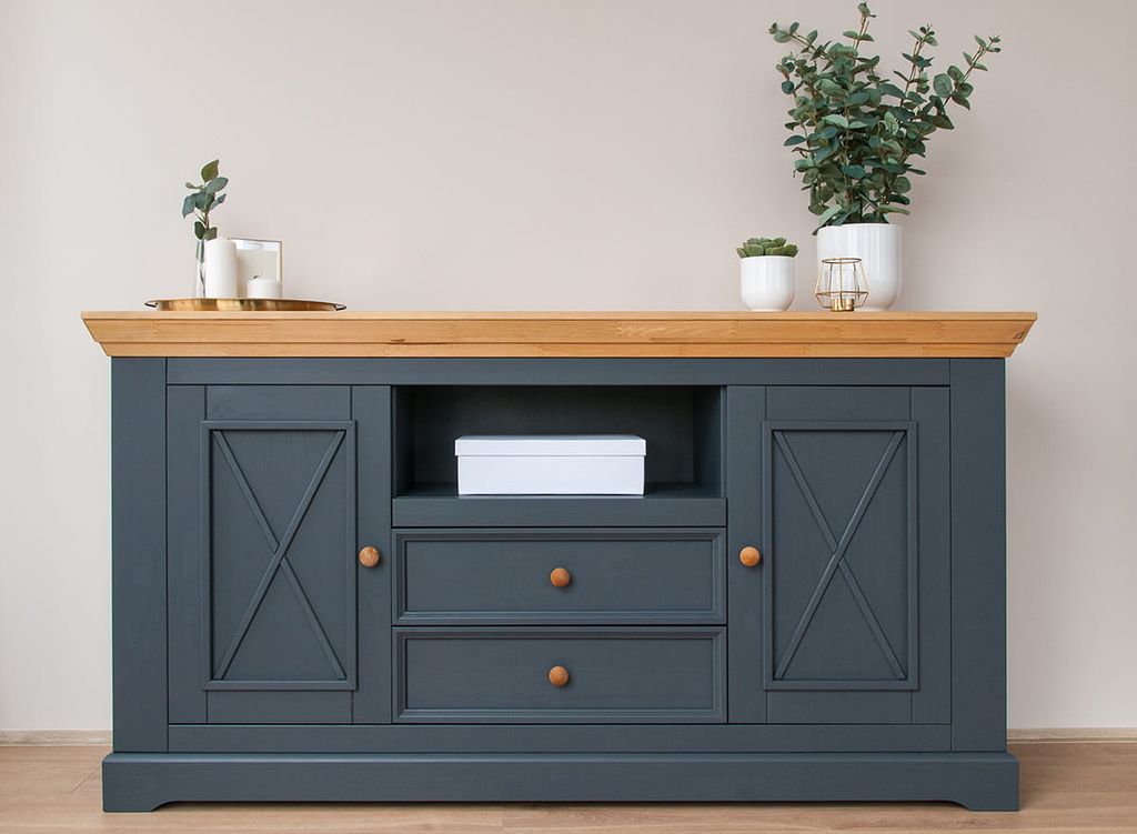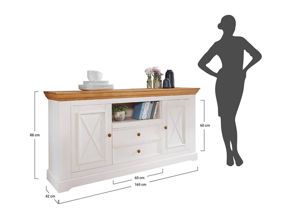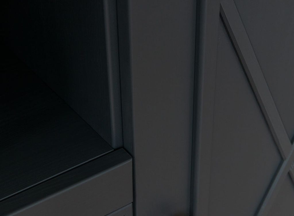 Комод имеет два выдвижных ящика на роликовых направляющих, две глухих дверки, за каждой дверкой деревянная полка.