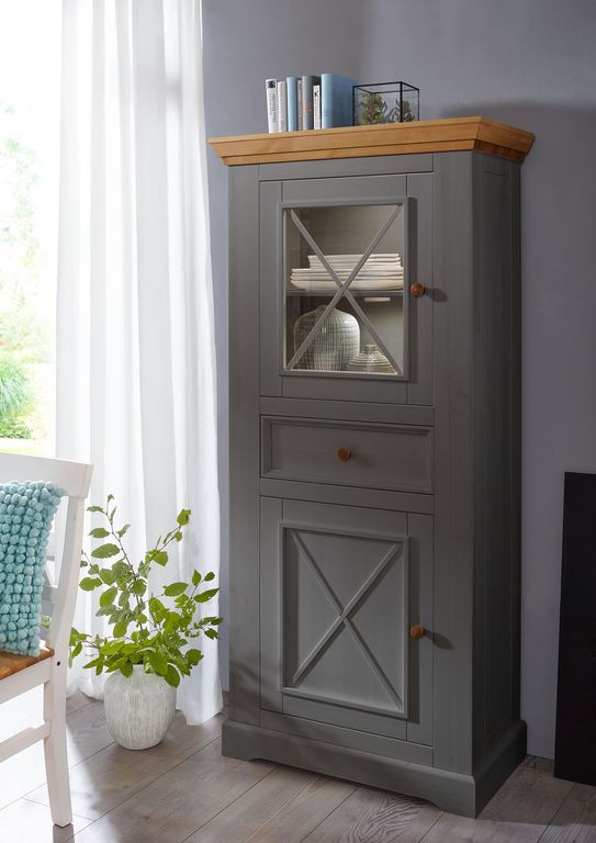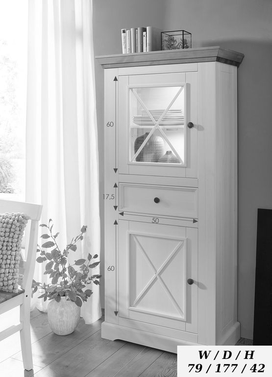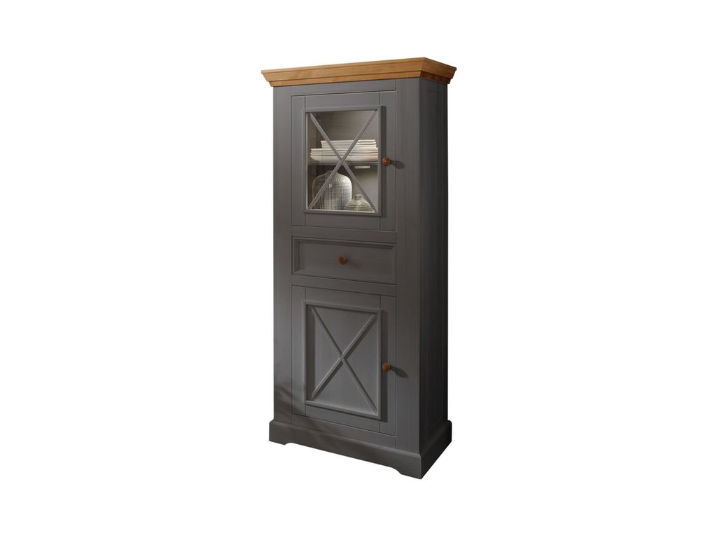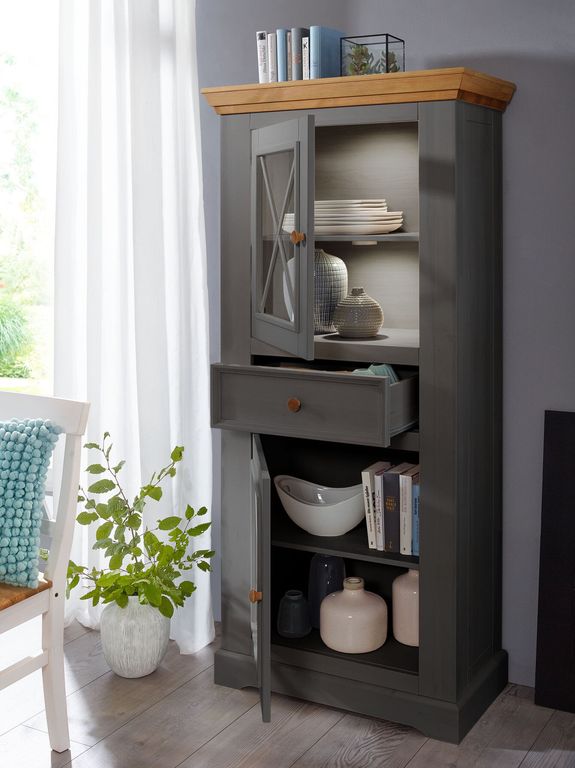 Шкаф для посуды имеет выдвижной ящик на роликовых направляющих, глухую и стеклянную дверки, за каждой дверкой деревянная полка.