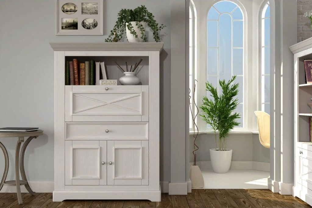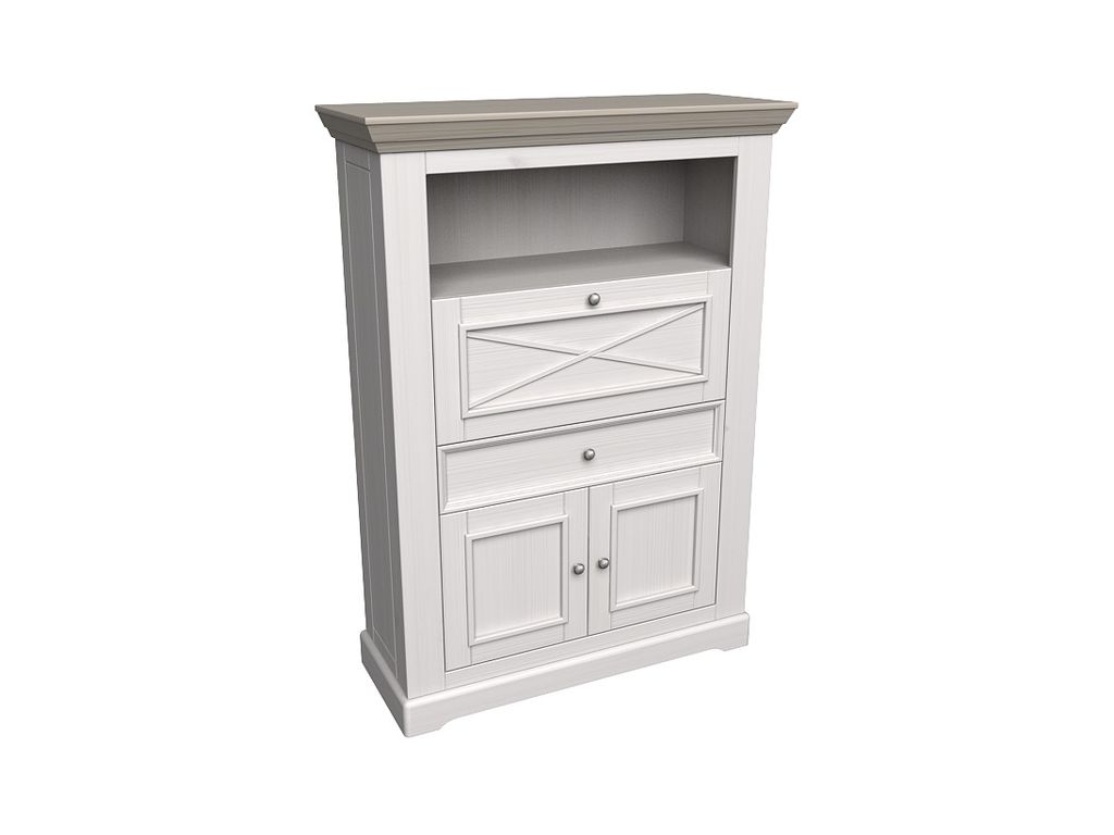 Комод имеет выдвижной ящик на роликовых направляющих, две глухих и одну откидную дверку.
