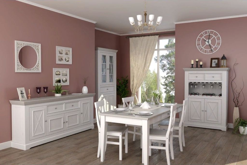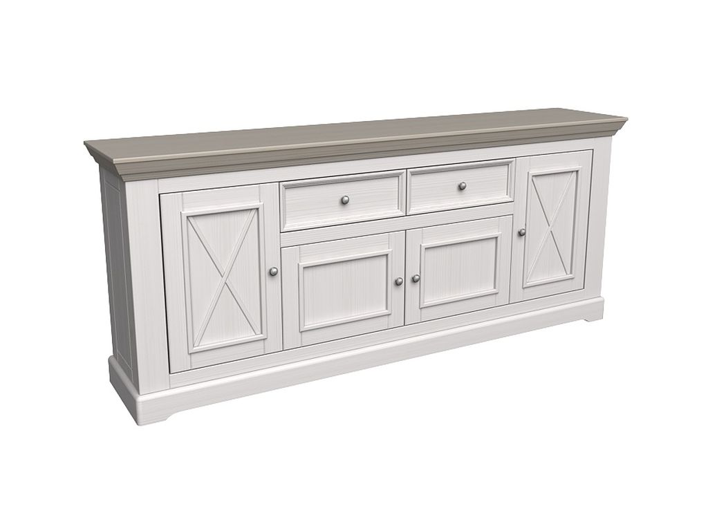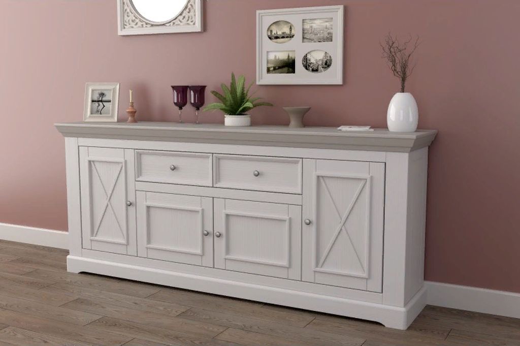 Комод имеет два выдвижных ящика на роликовых направляющих, четыре глухих дверки, за каждой высокой дверкой имеется деревянная полка.