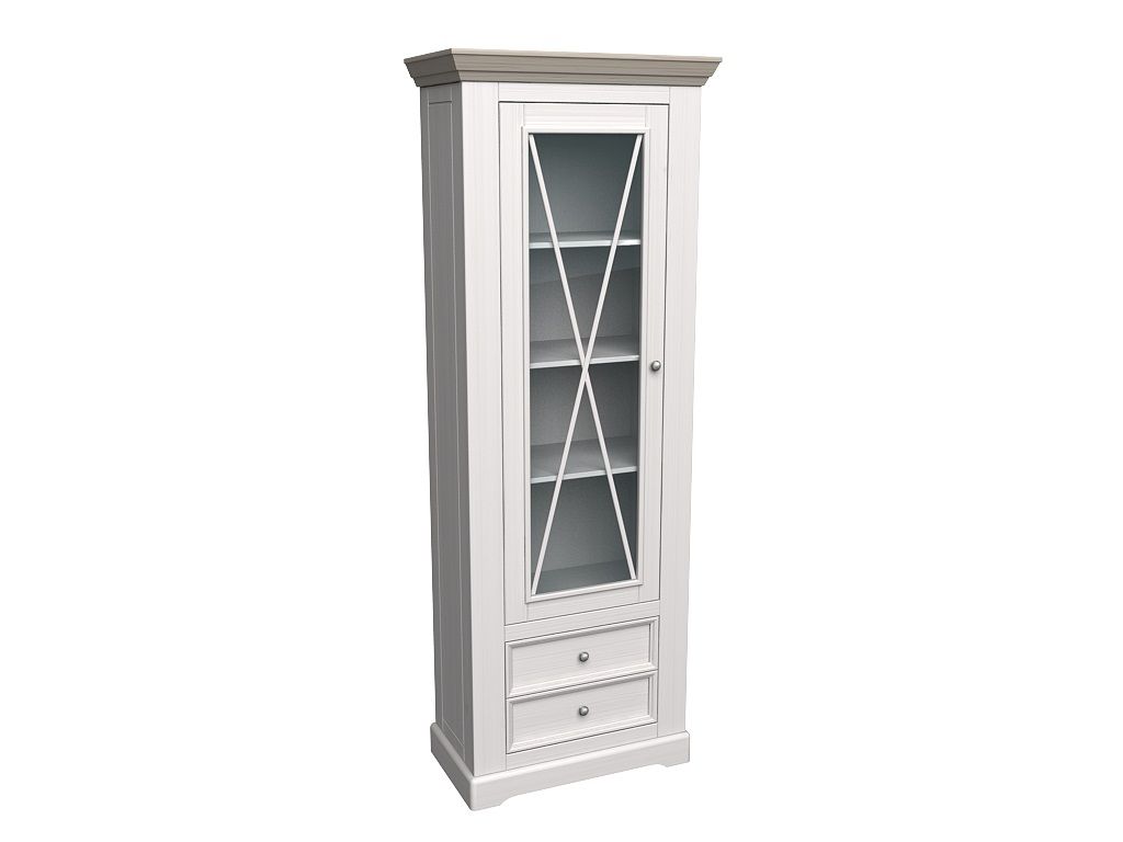 Шкаф для посуды имеет два выдвижных ящика на роликовых направляющих и дверь со стеклом, за дверкой три деревянные полки.