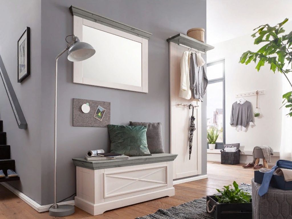 Вешалка крепится на стену и имеет штангу для вешалок и четыре крючка для одежды и аксессуаров.