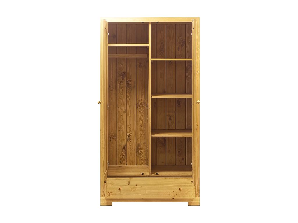 За одной дверью штанга и полка, за другой 3 полки. Глубина полок — 50 см, ширина штанги — 47 см, Расстояние между полками — 37,5 см. Ручки деревянные 4 шт. Поставляется в сборе.