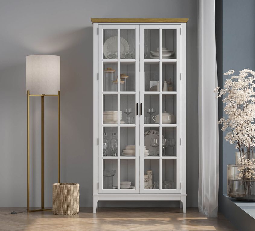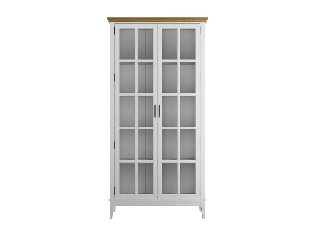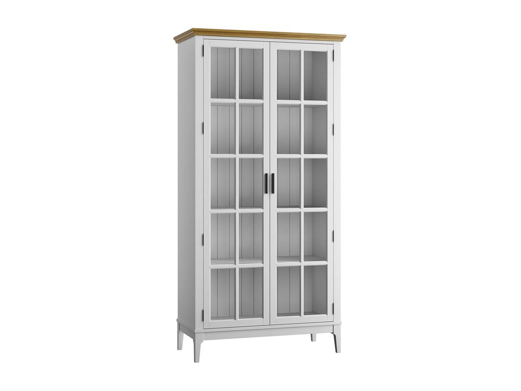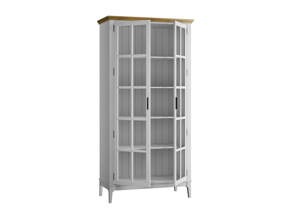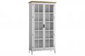 Описание: высокий шкаф с полками за распашными стеклянными дверями.