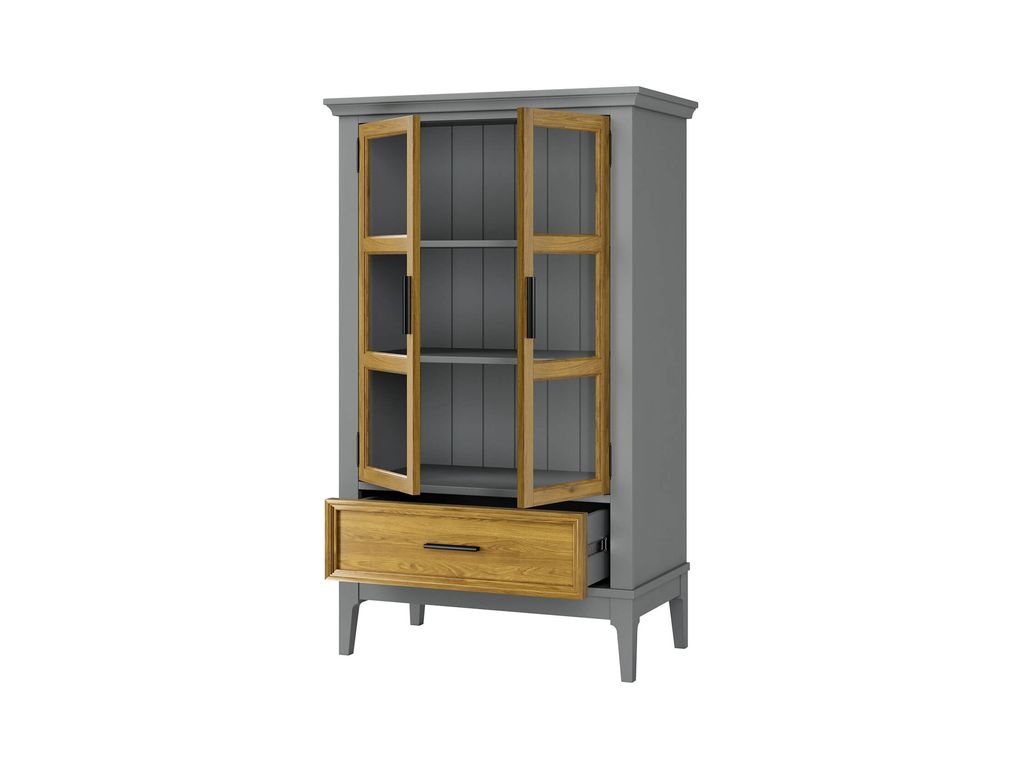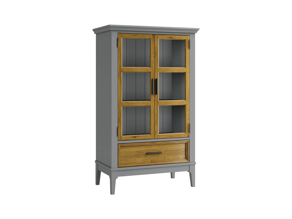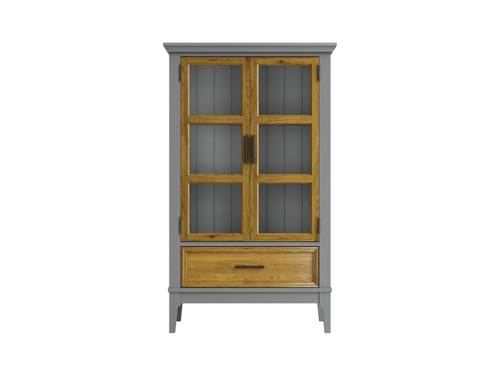 Описание: высокий шкаф с распашными стеклянными дверями, за которыми располагаются 2 съемные полки. Внизу один выдвижной ящик.