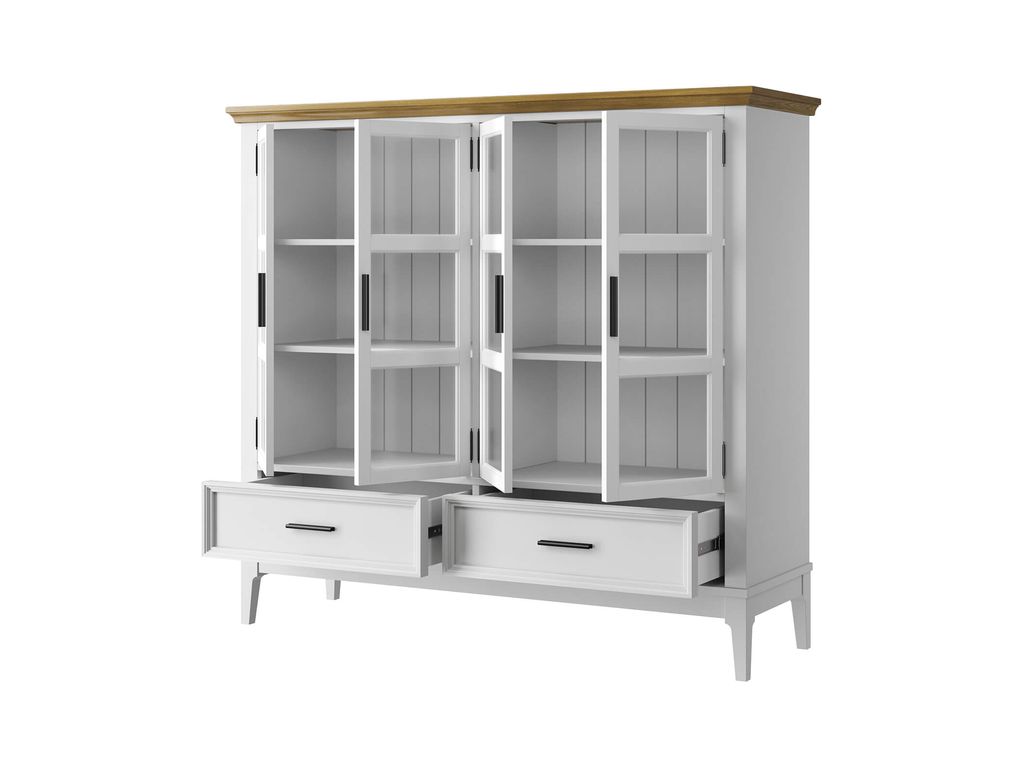 Описание: высокий шкаф с двумя отделами с распашными стеклянными дверями, за которыми располагаются 4 съемные полки. Внизу два выдвижных ящика.