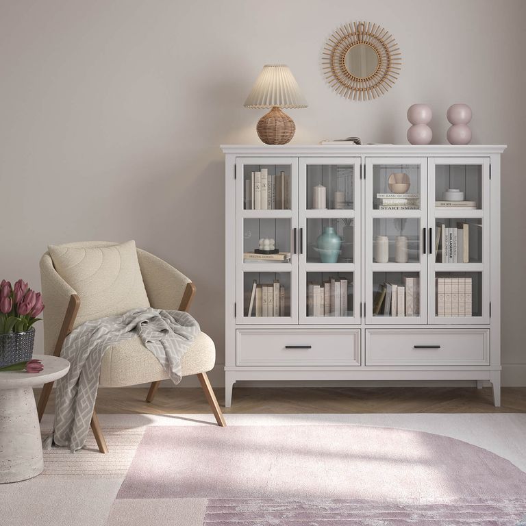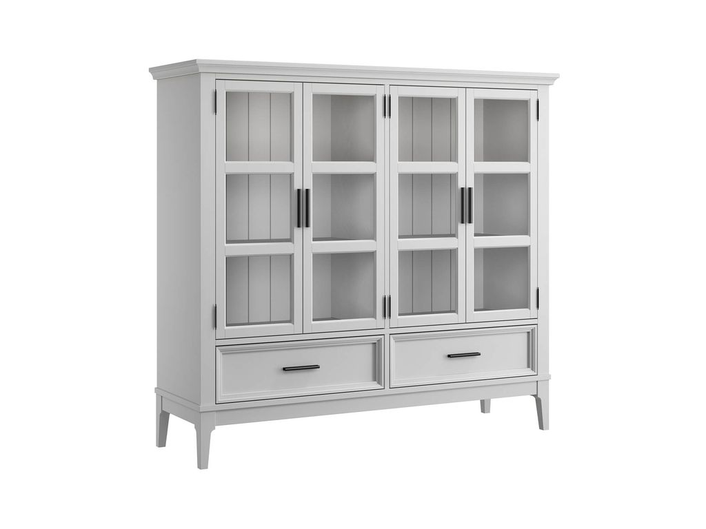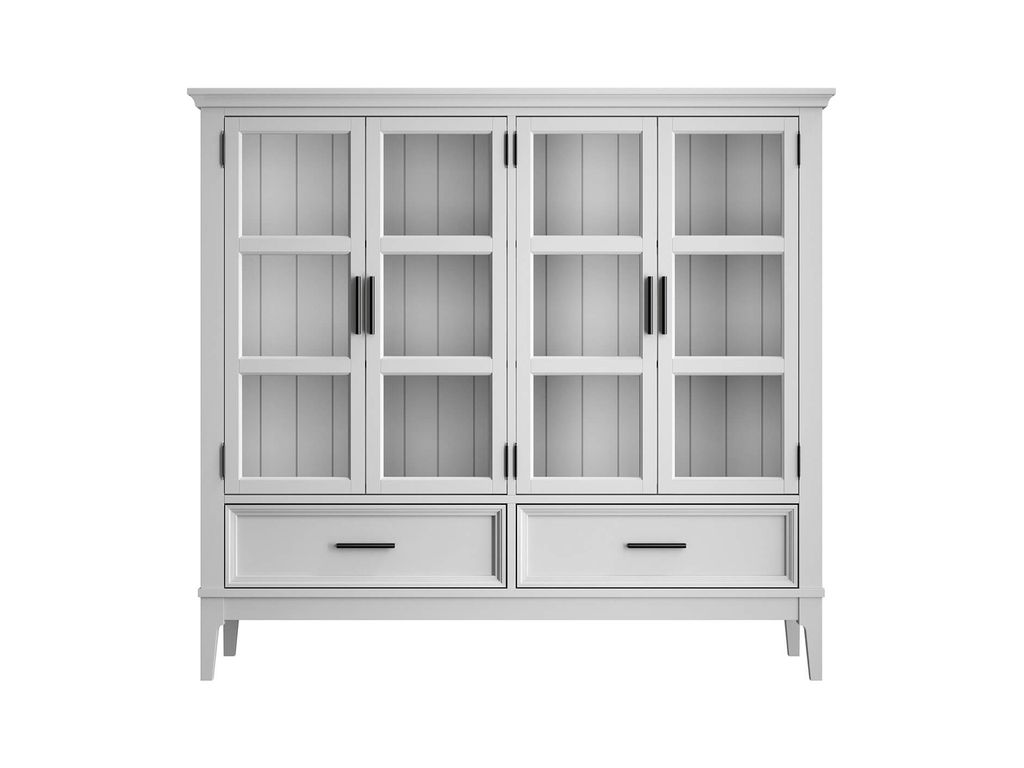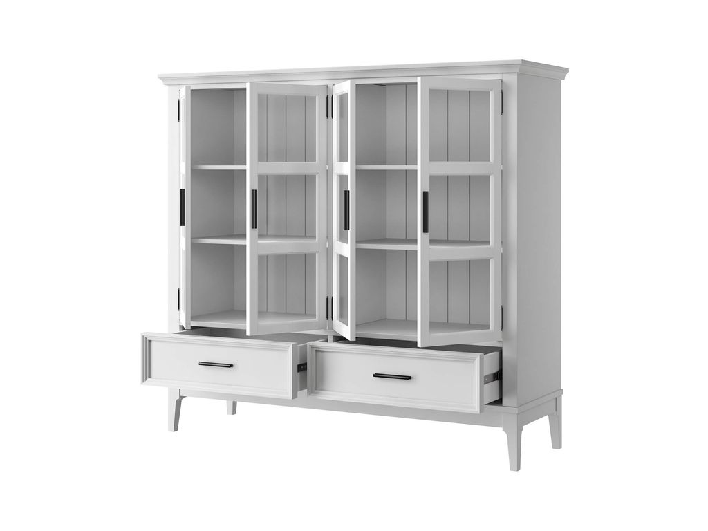 Описание: высокий шкаф с двумя отделами с распашными стеклянными дверями, за которыми располагаются 4 съемные полки. Внизу два выдвижных ящика.