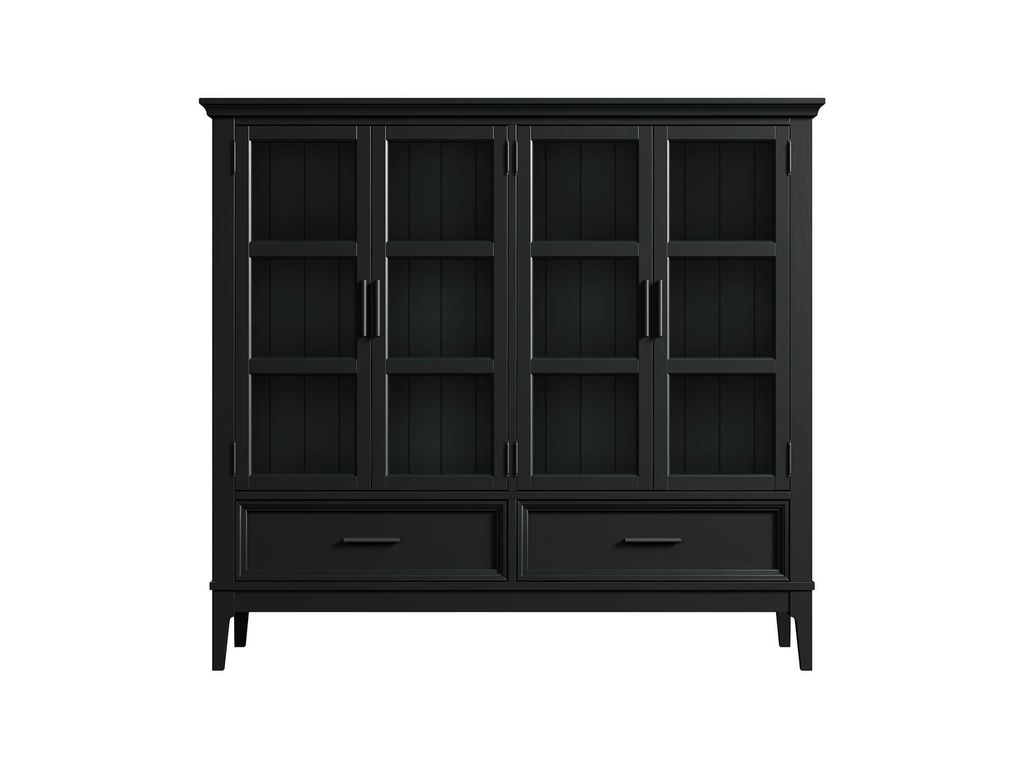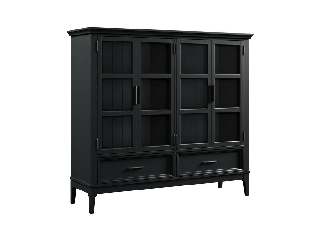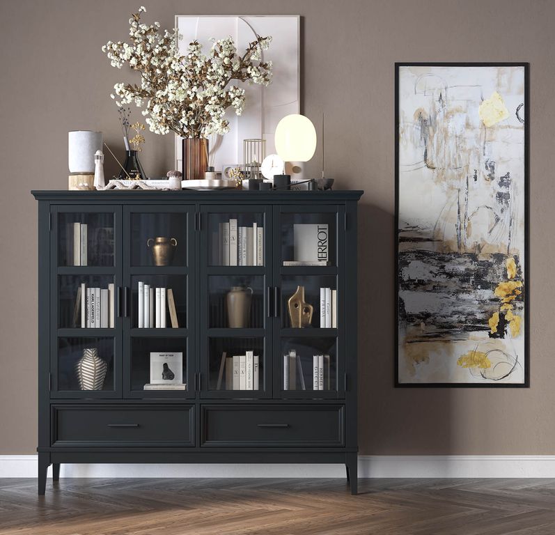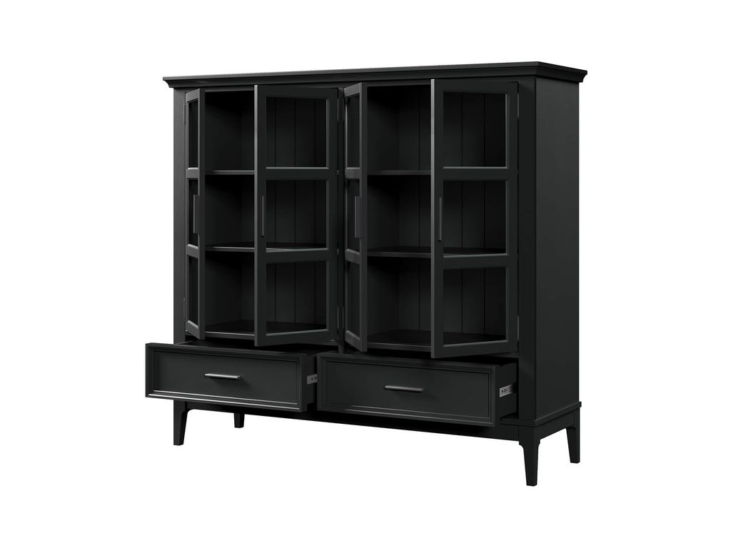Описание: высокий шкаф с двумя отделами с распашными стеклянными дверями, за которыми располагаются 4 съемные полки. Внизу два выдвижных ящика.