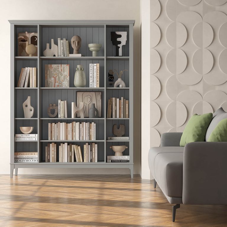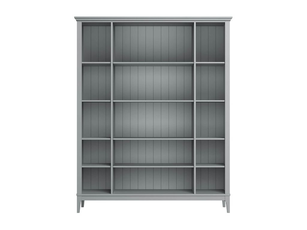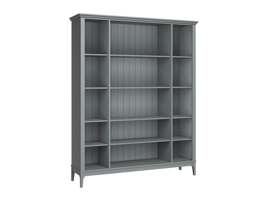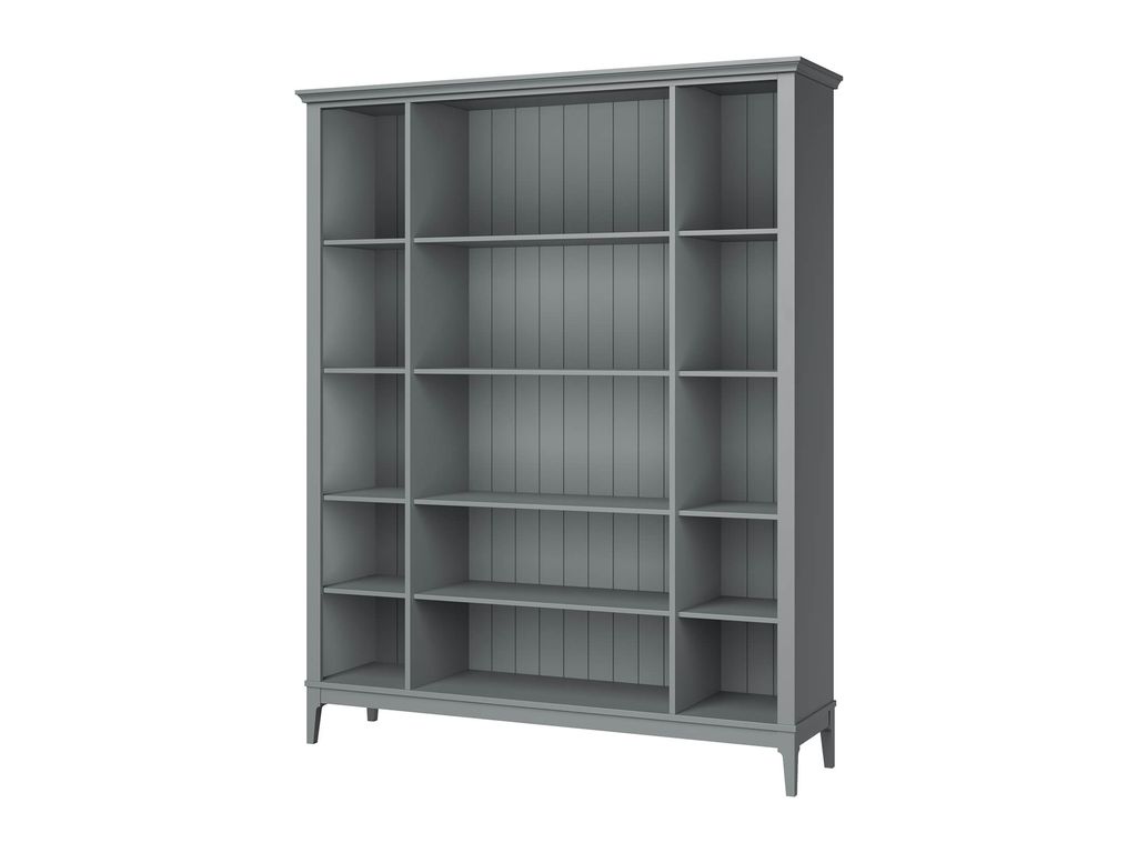 Описание: высокий стеллаж, разделенный на три вертикальных секции, в каждой из которых четыре полки.