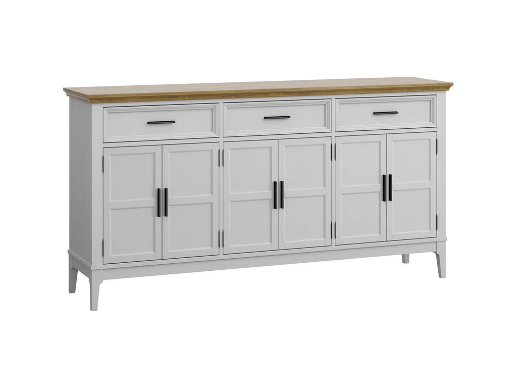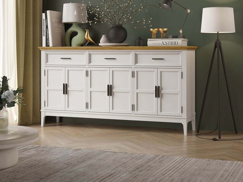 Описание: широкая и вместительная тумба. Состоит из трех вместительных отделений с полками за распашными дверками, сверху три выдвижных ящика. Подойдет как для прихожей, спальни или гостиной в городской квартире, так и для загородного дома.