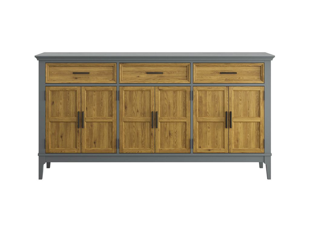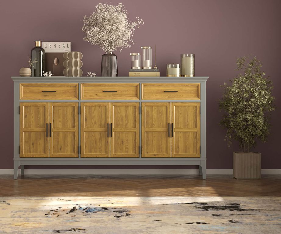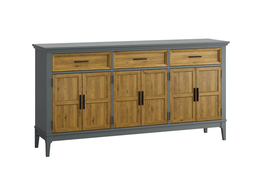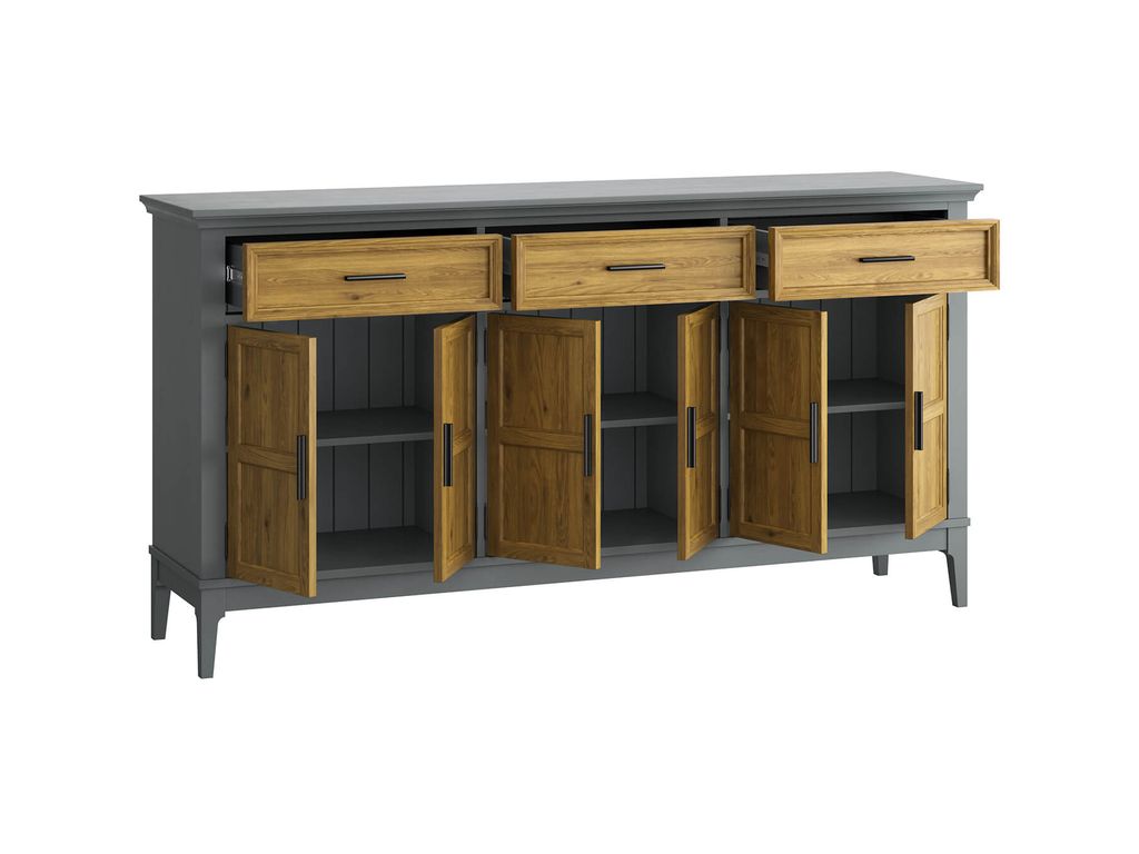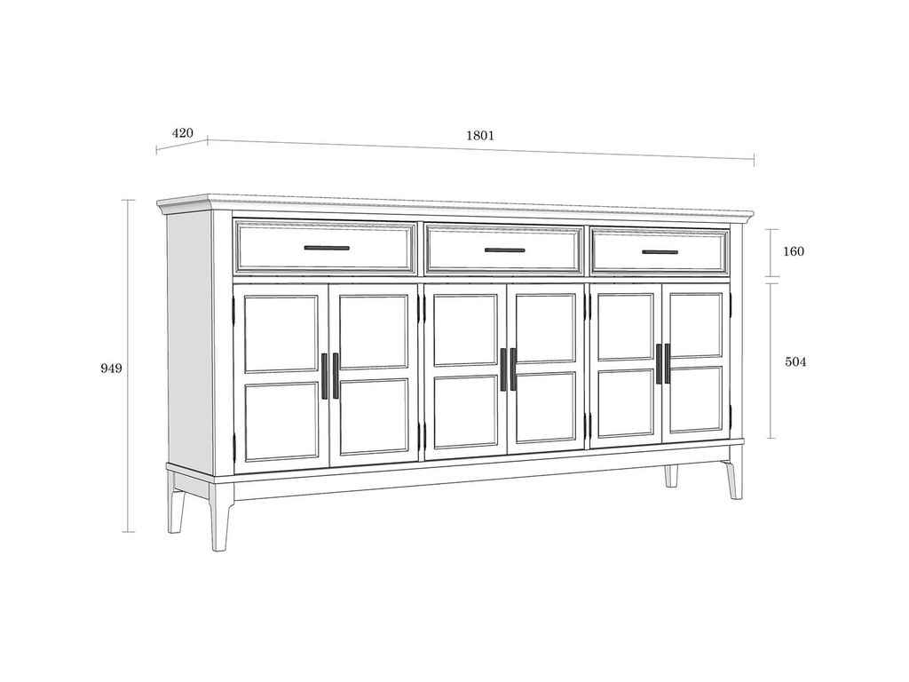 Описание: широкая и вместительная тумба. Состоит из трех вместительных отделений с полками за распашными дверками, сверху три выдвижных ящика. Подойдет как для прихожей, спальни или гостиной в городской квартире, так и для загородного дома.