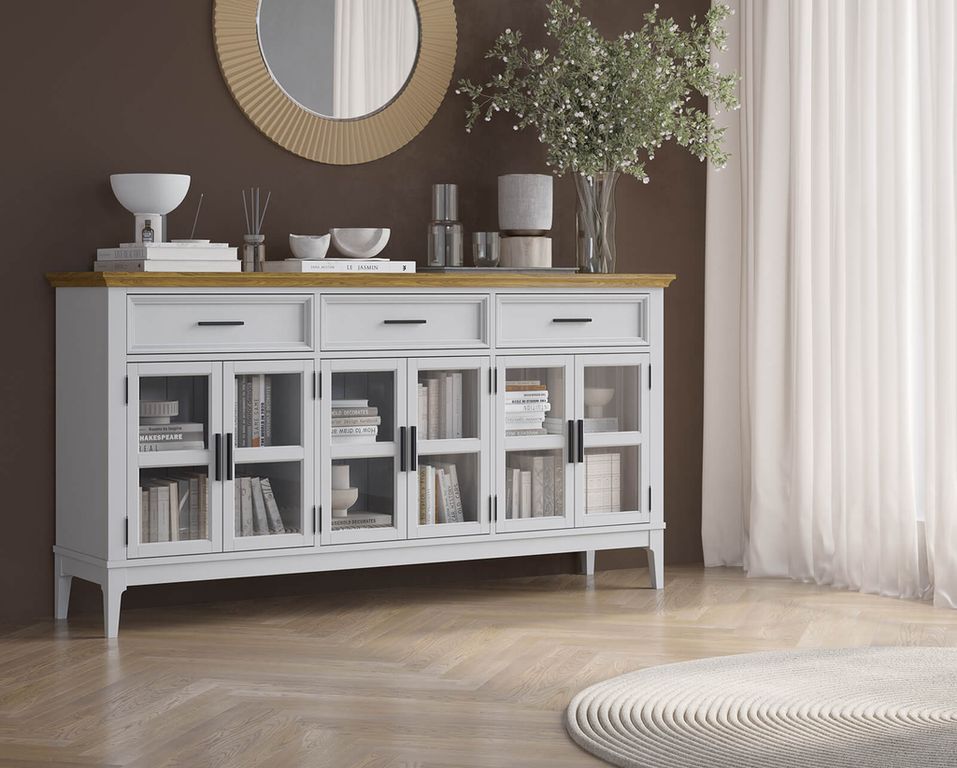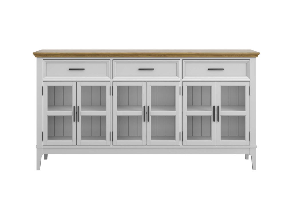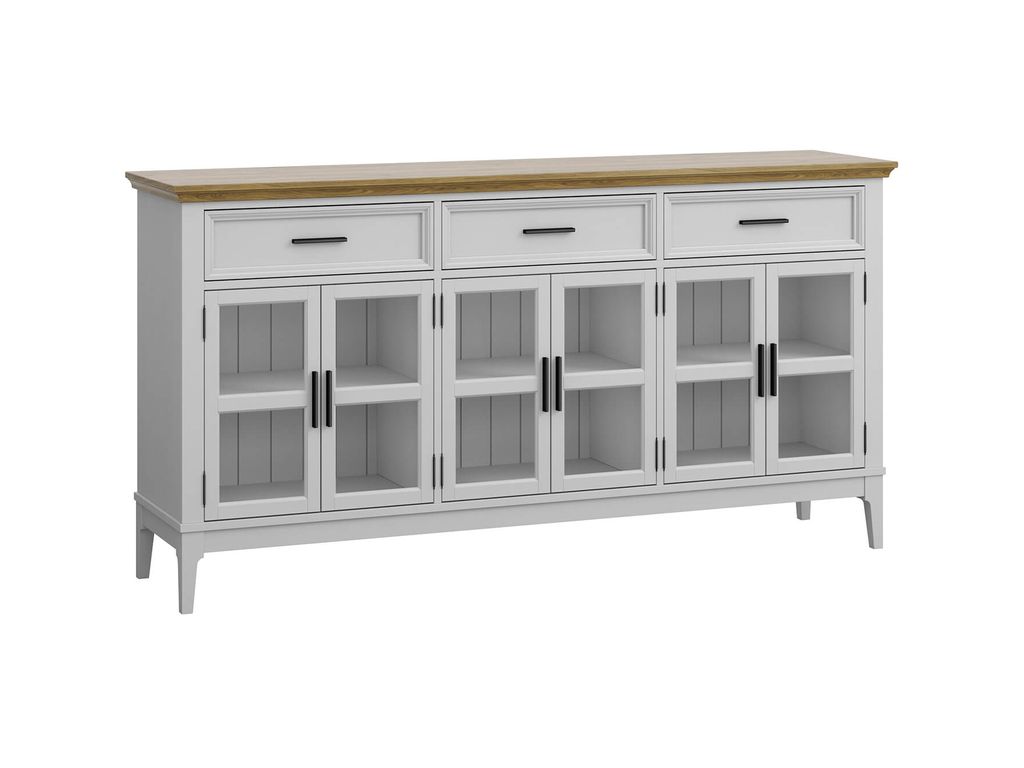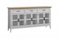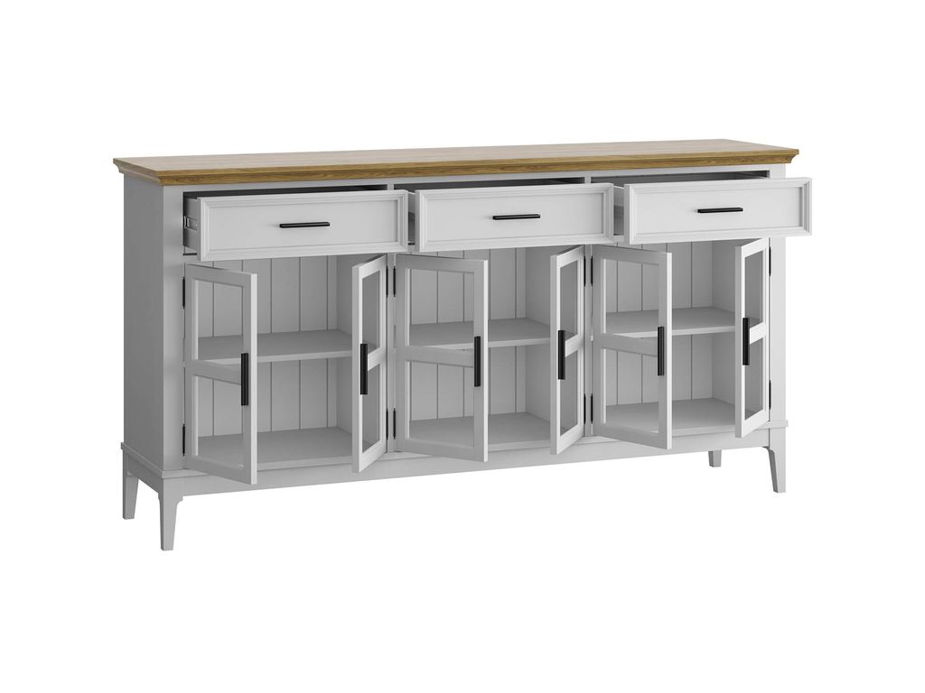 Описание: широкая и вместительная тумба. Состоит из трех вместительных отделений с полками за распашными, стеклянными дверками, сверху три выдвижных ящика. Подойдет как для прихожей, спальни или гостиной в городской квартире, так и для загородного дома.